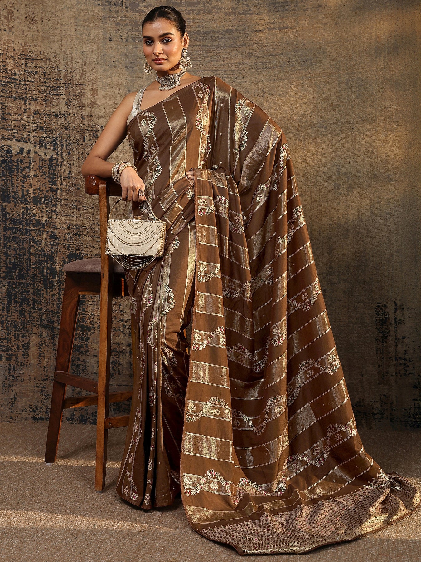 Brown Woven Design Silk Blend Saree With Unstitched Blouse Piece