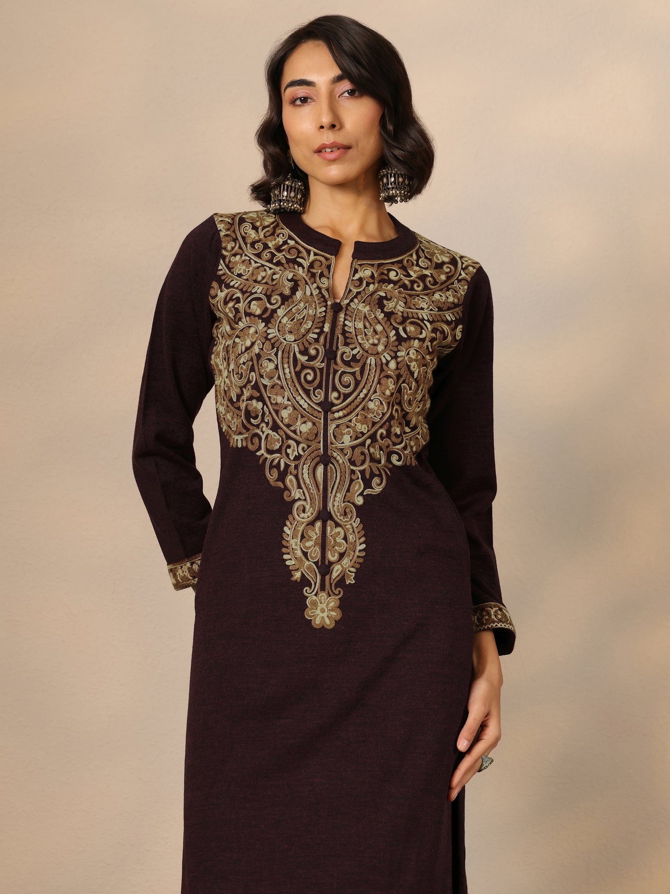Our 3-piece brown wool kurta set features a straight-fit kurta with a mandarin collar neckline, regular sleeves, and statement yoke. Complemented with straight pants with a partially elasticated waistband and 2 pockets, and an embroidered dupatta. Adorned with Paisley Embroidered, this style is perfect for Dark Festive occasions.