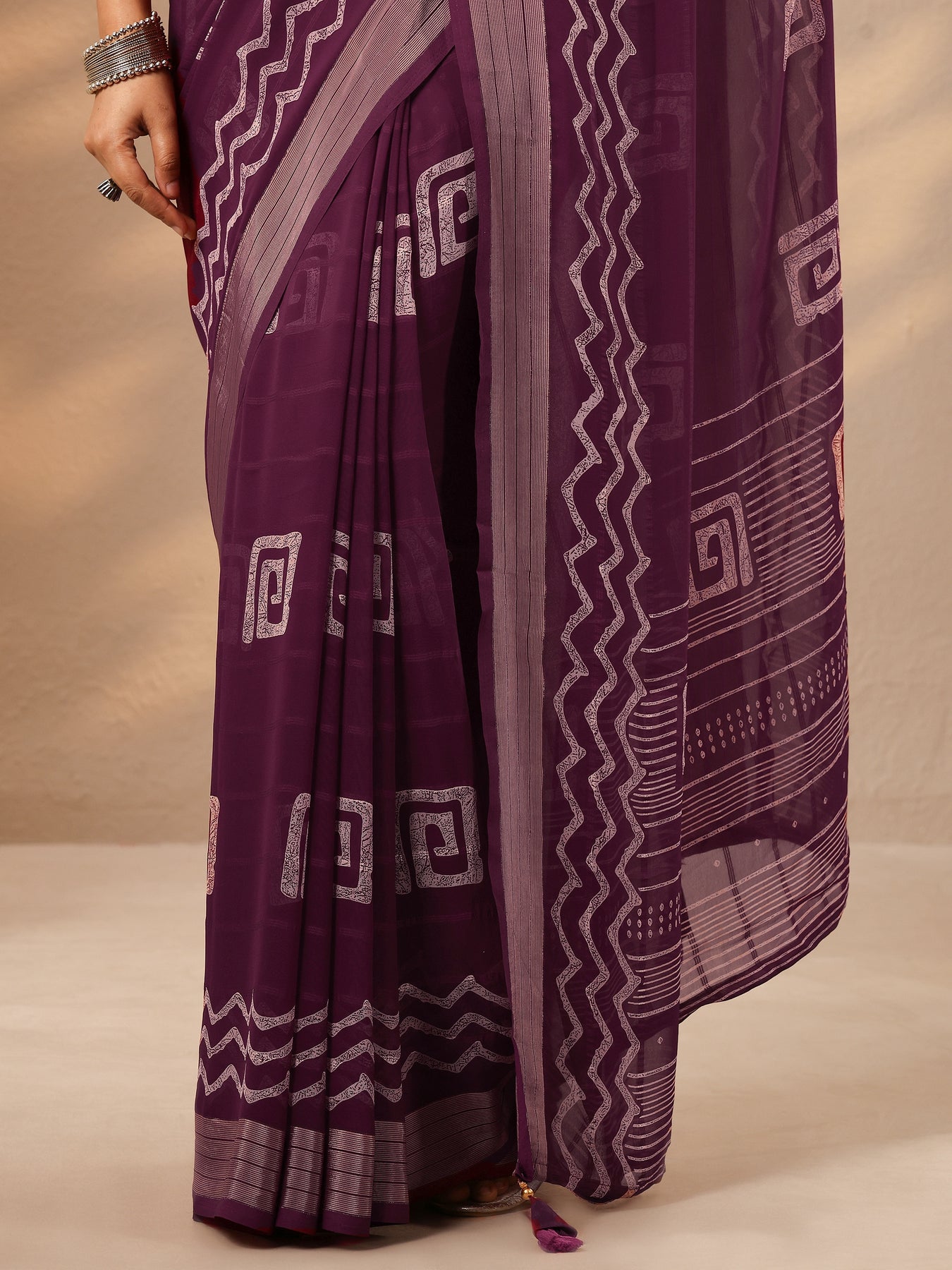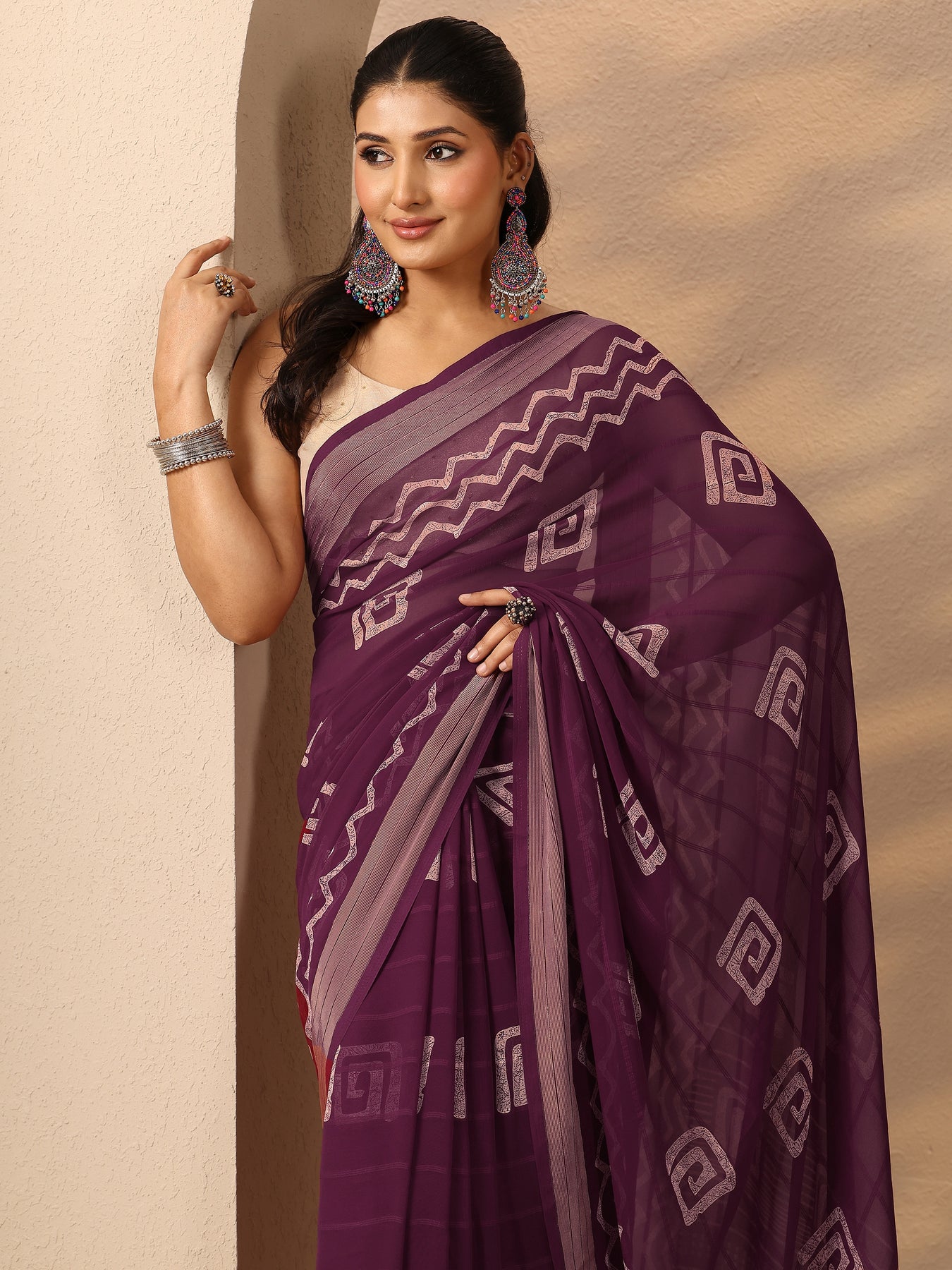 Burgundy Printed Georgette Saree With Unstitched Blouse Piece