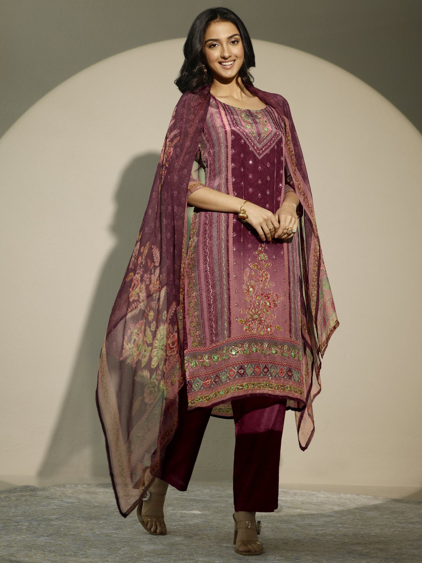 Burgundy Printed Muslin Straight Suit Set With Dupatta