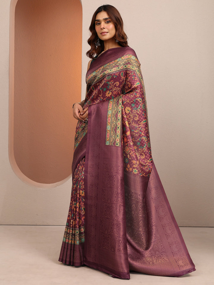 Burgundy Printed Silk Blend Saree With Unstitched Blouse Piece