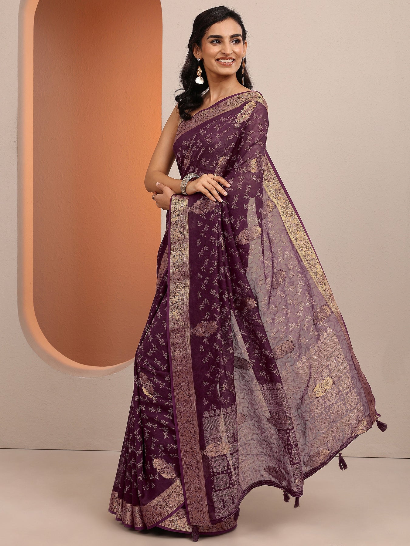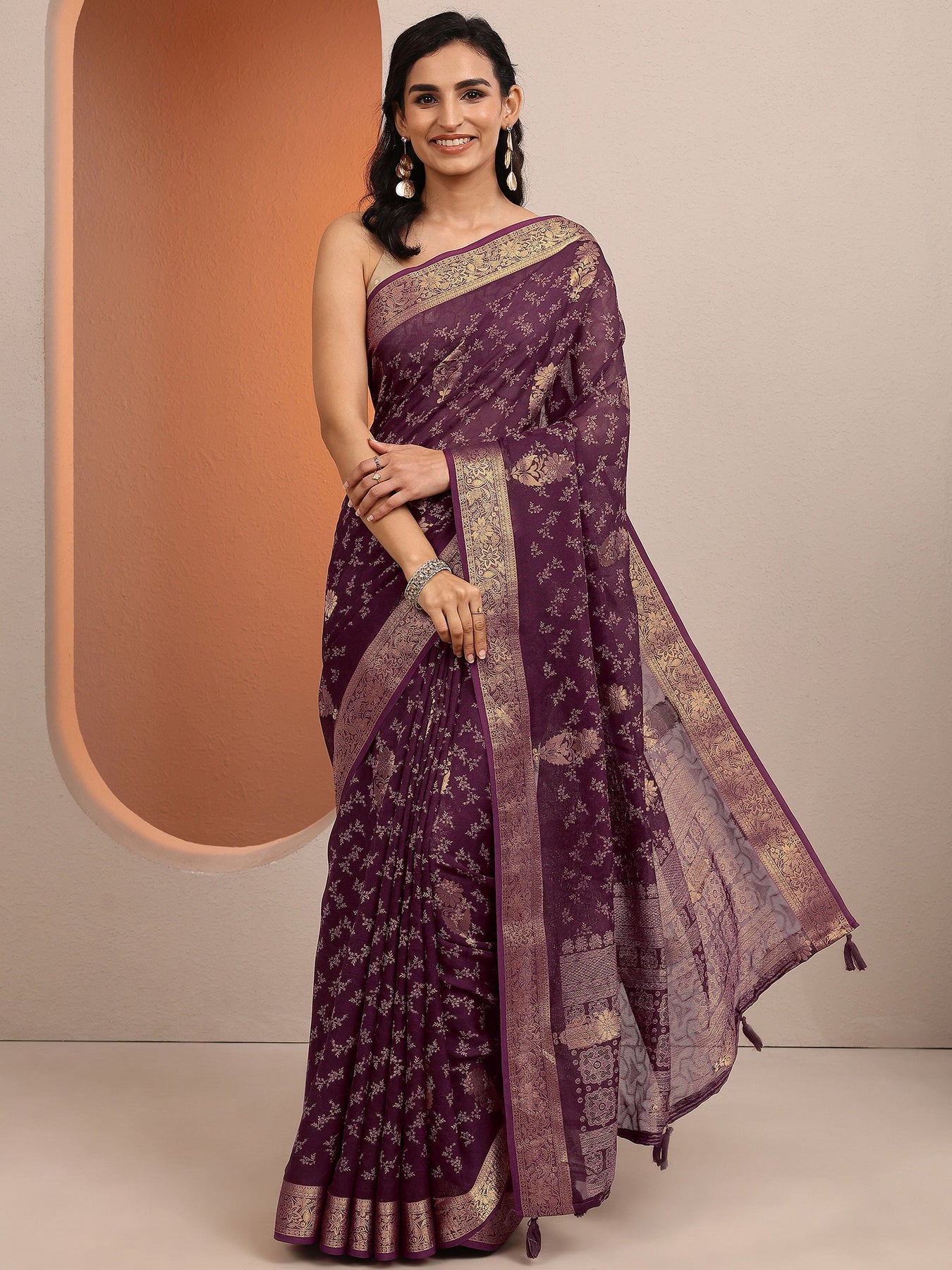 Burgundy Printed Silk Blend Saree With Unstitched Blouse Piece