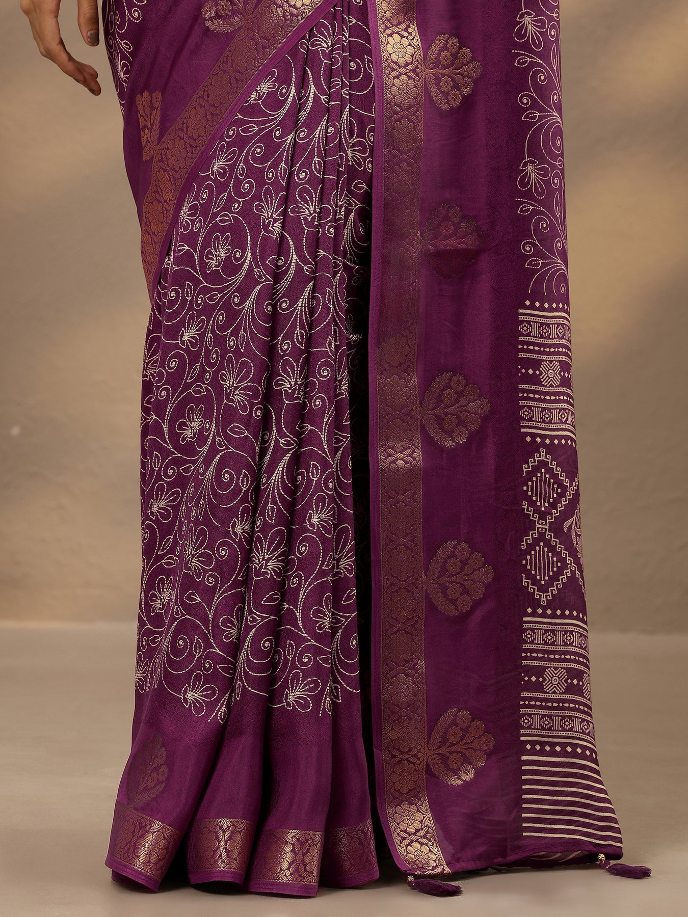 Our Burgundy Printed Silk Blend Saree Features Captivating Floral. Complemented With An Unstitched Blouse Piece. This Charming Saree Is Perfect For Festive Occasions.