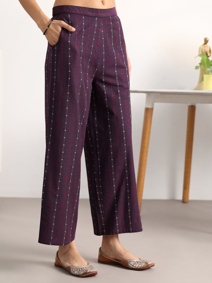 Burgundy Striped Woven Design Cotton Blend A-Line Kurta Set