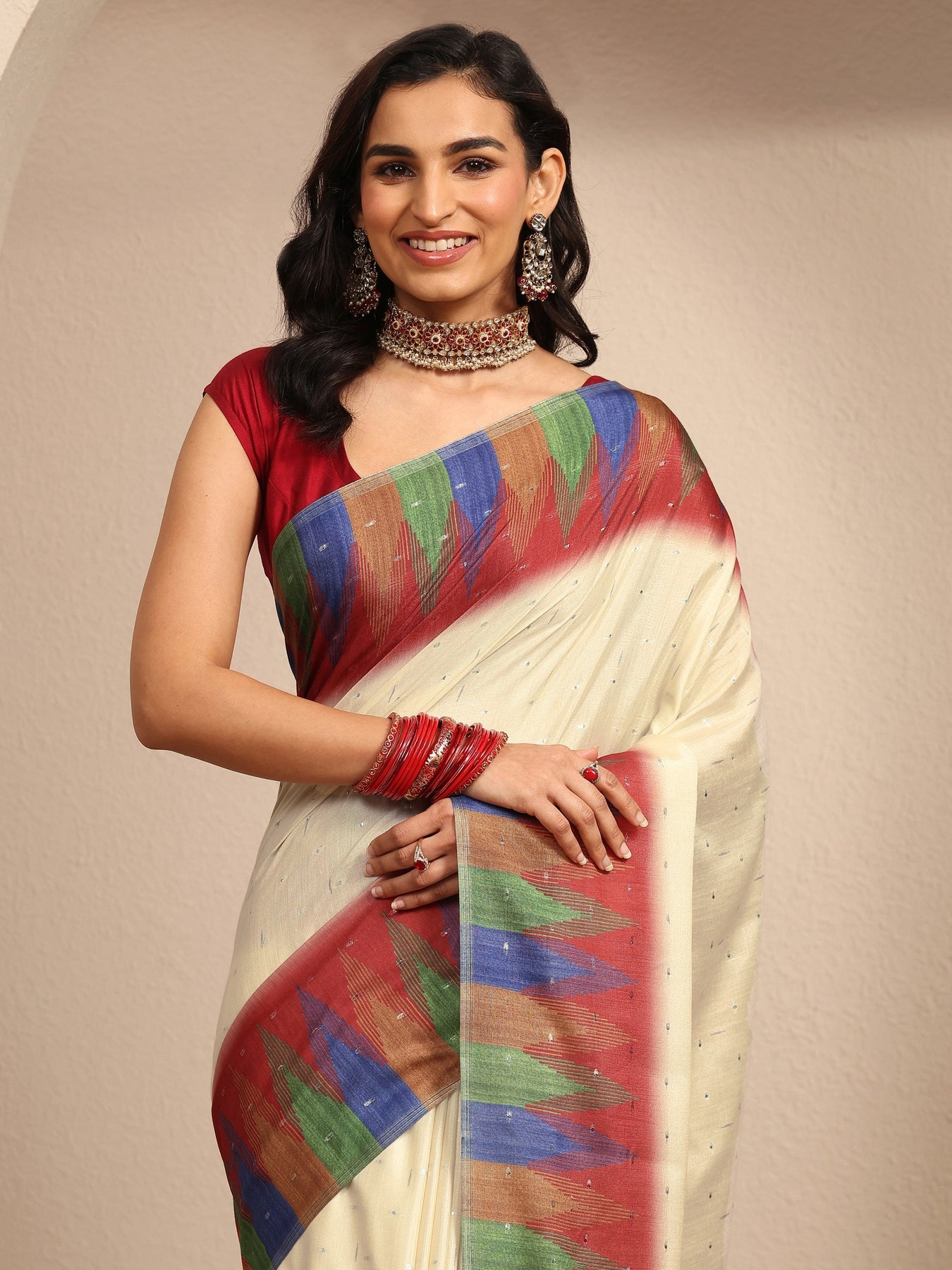 Cream Ikat Woven Design Silk Blend Saree With Unstitched Blouse Piece