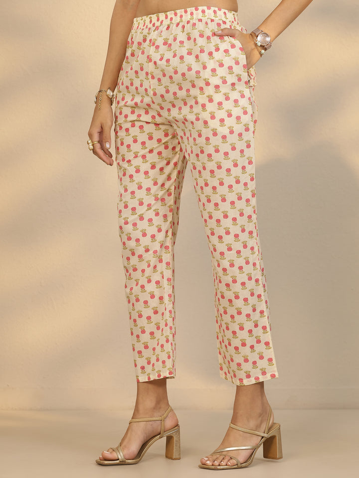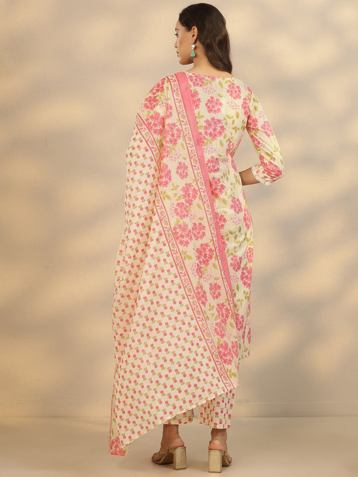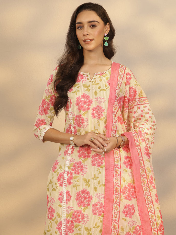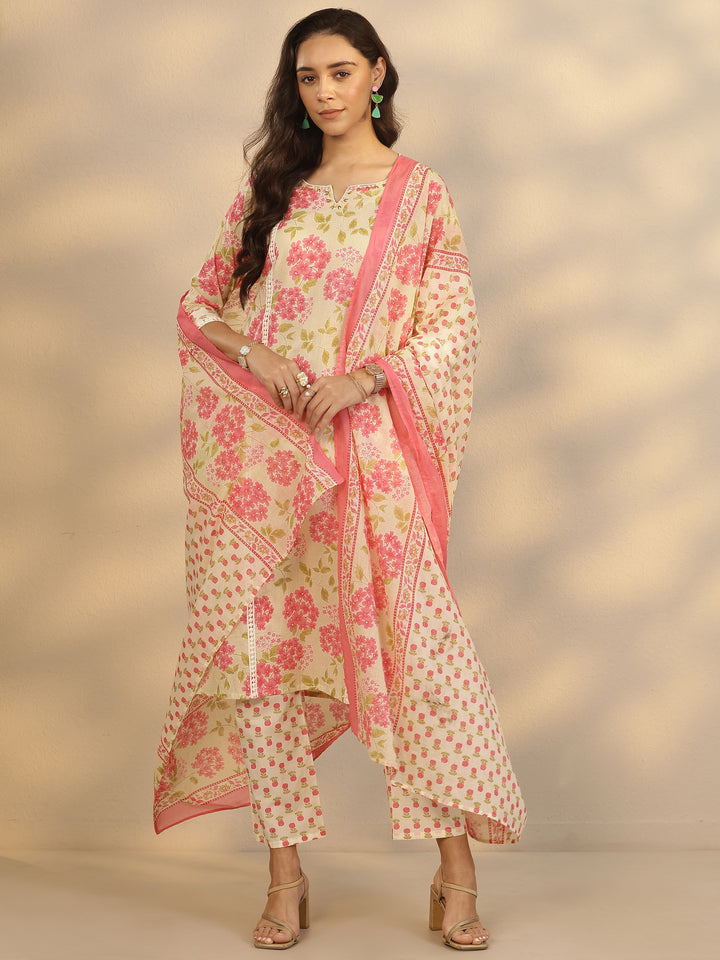 Cream Printed Cotton Straight Suit Set With Dupatta