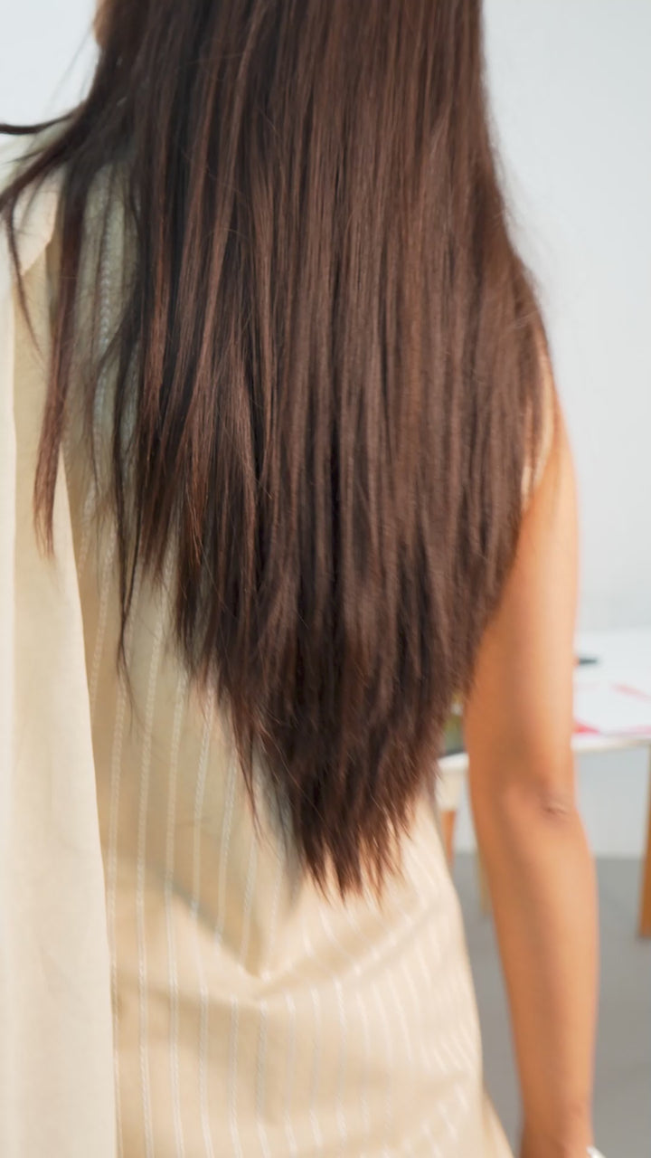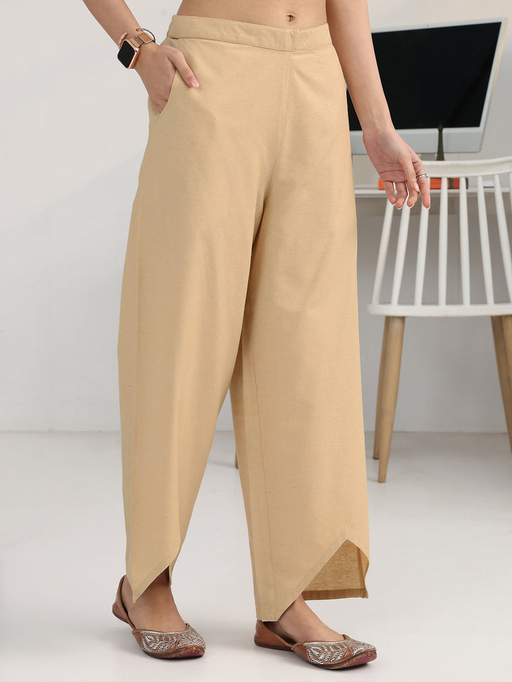 Our 3-piece beige cotton blend straight-fit kurta set features a sweetheart neckline and statement yoke. Complemented with palazzo pants with a partially elasticated waistband and 2 pockets, and a solid dupatta. Adorned with striped woven design, this style is perfect for Work Wear and Casual Wear.
