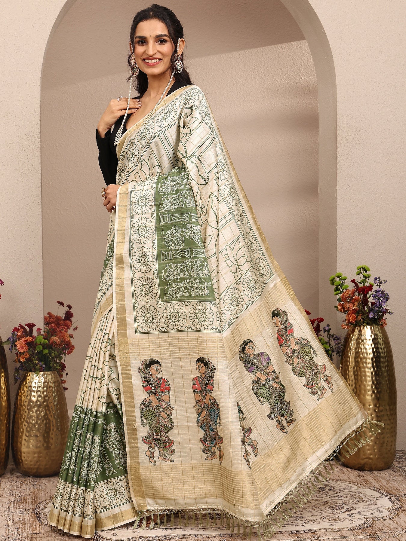 Cream Tribal Printed Silk Blend Saree With Unstitched Blouse Piece