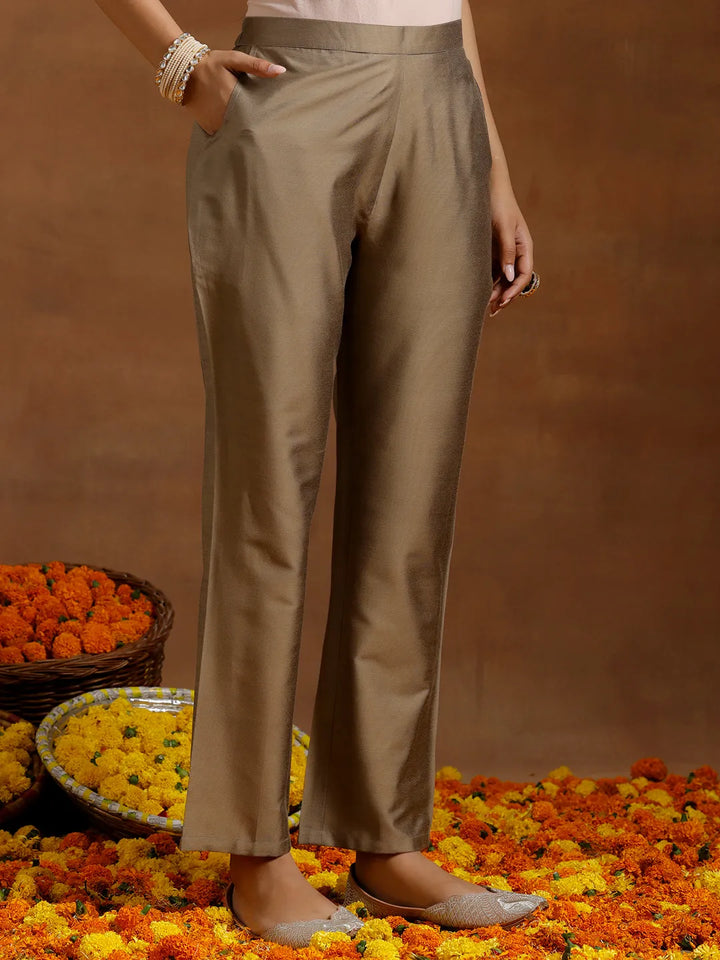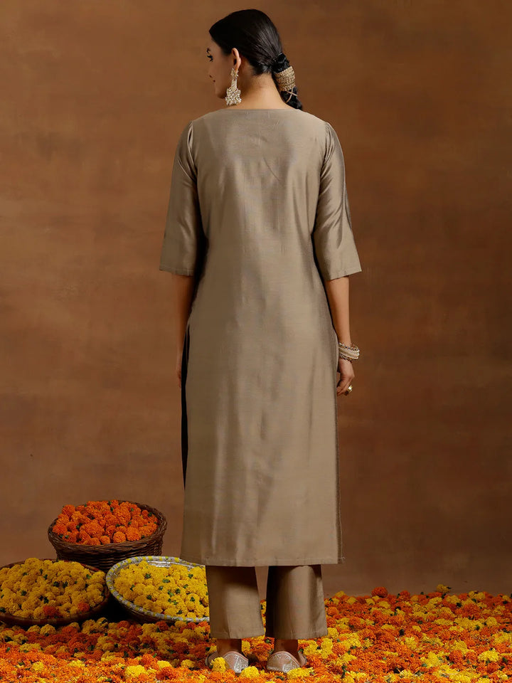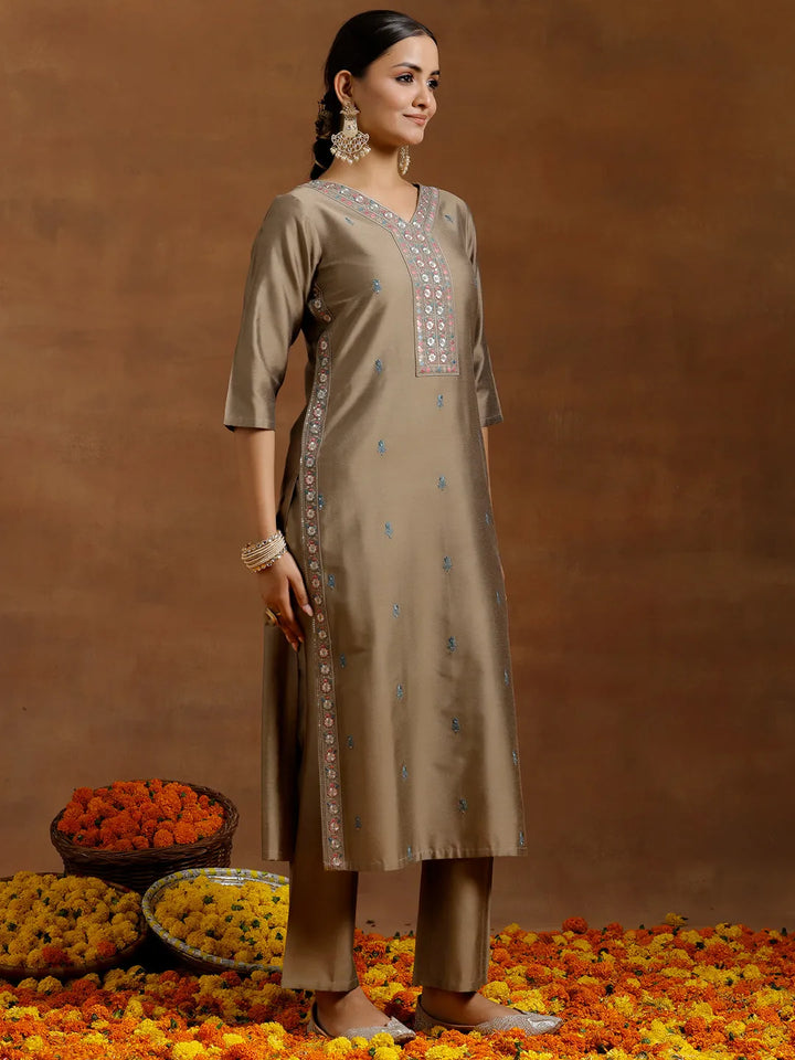 Our 3-piece gold embroidered silk blend straight suit set features a kurta with a V-neckline, three-quarter sleeves, and a statement yoke. Complemented with trousers with a partially elasticated waistband and roomy pockets, and a dupatta. Elevated with intricate thread work and delicate sequins, this style is perfect for festive celebrations.