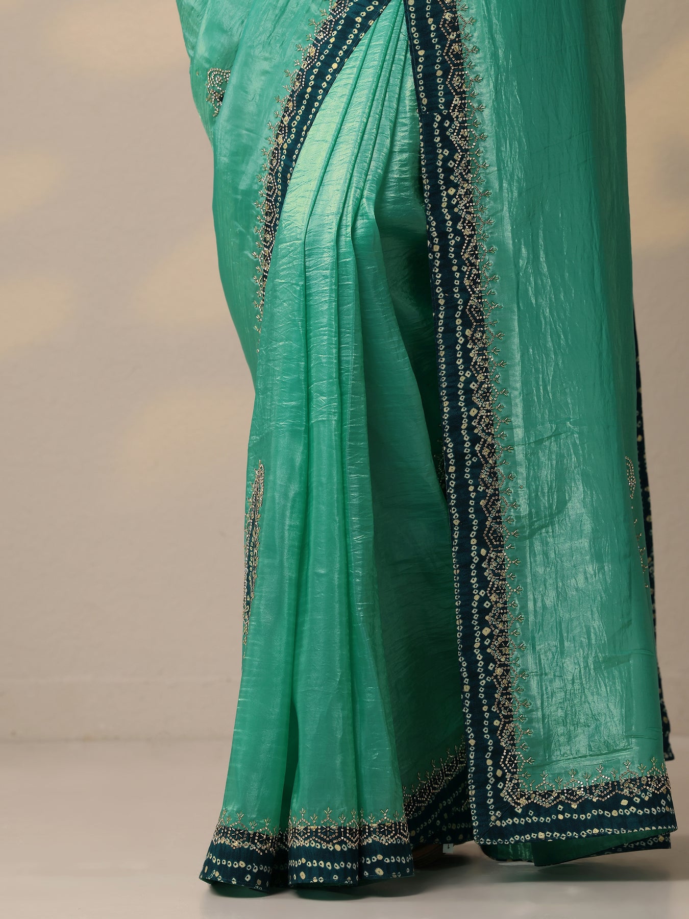 Green Embellished Organza Sarees With Unstitched Blouse Piece