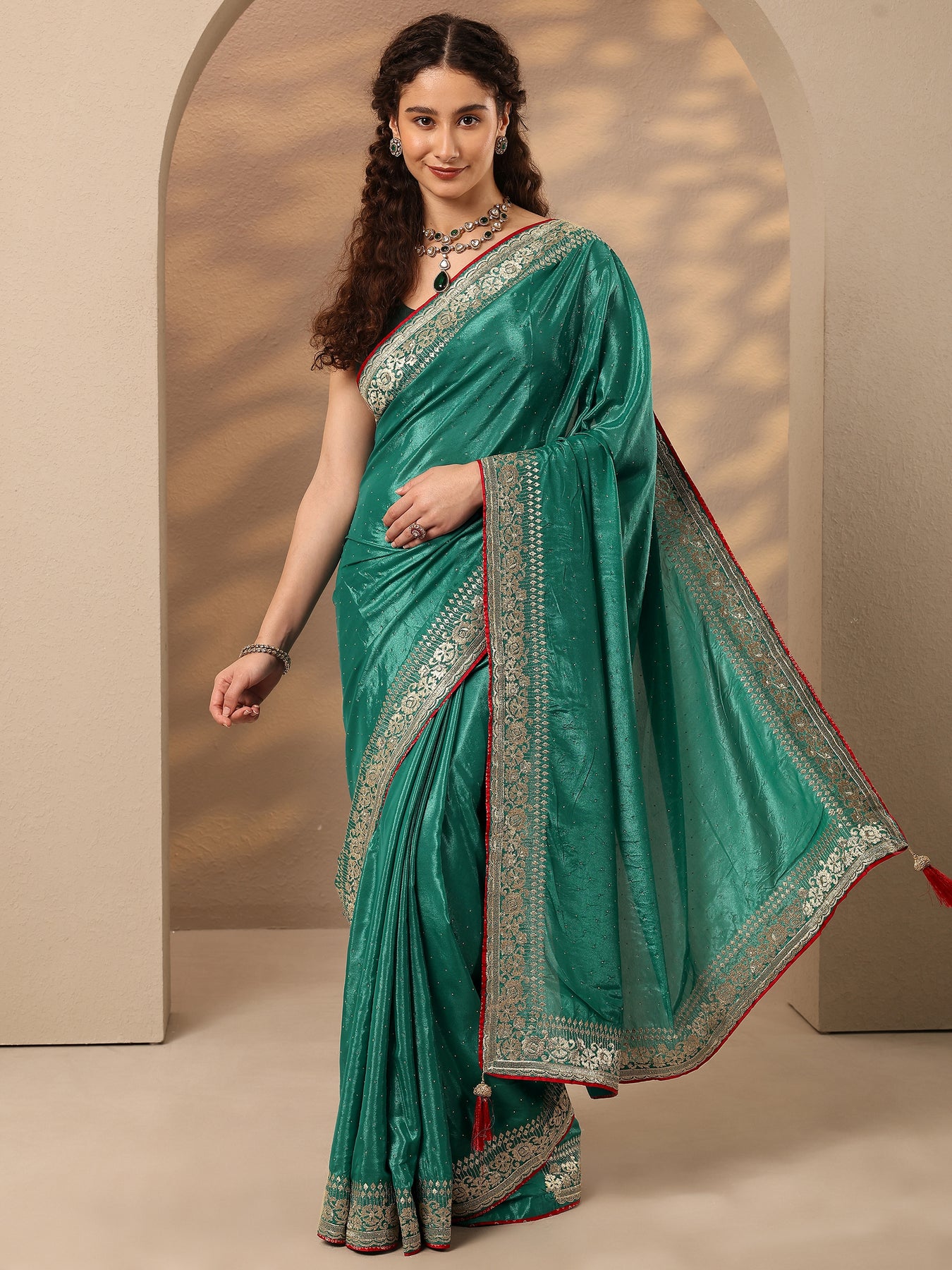 Our Green Embroidered Silk Blend Saree Features Captivating Embellished. Complemented With An Unstitched Blouse Piece. This Charming Saree Is Perfect For Festive Occasions.