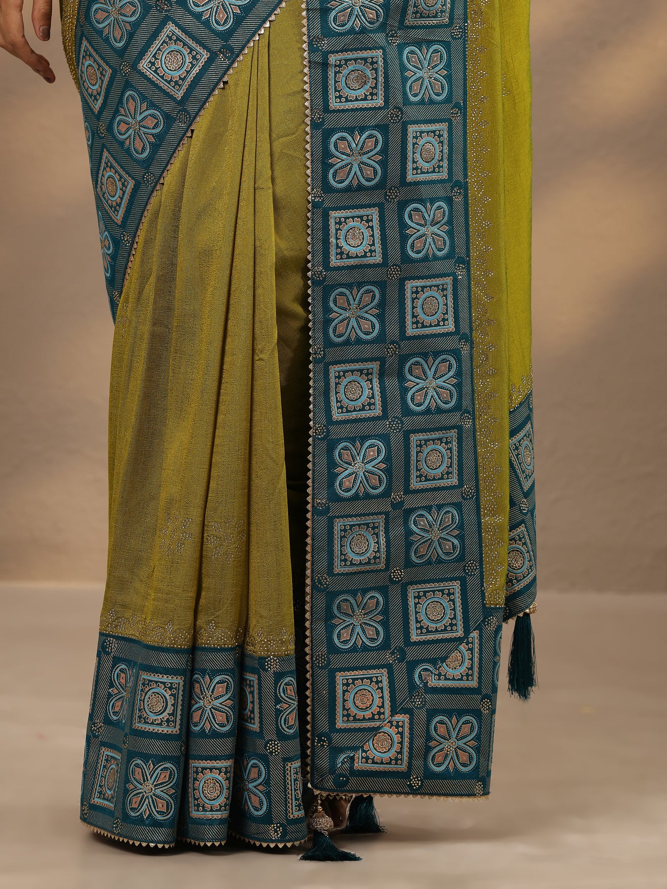 Our Green Embroidered Silk Blend Saree Features Captivating Embellished. Complemented With An Unstitched Blouse Piece. This Charming Saree Is Perfect For Festive Occasions.