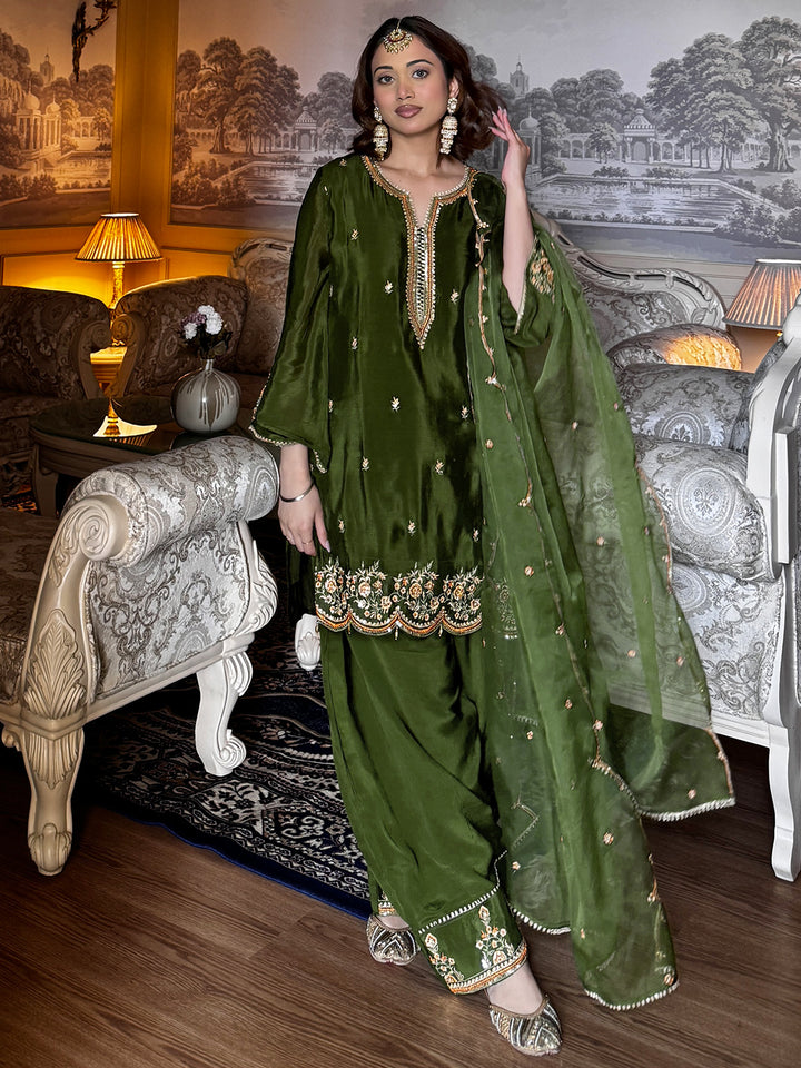 Our 3-piece Bottle Green Chinon Straight-Fit Kurta Set features a Sweetheart neck, Regular Sleeves, and statement yoke. Complemented with Straight Pants with a Partially Elasticated waistband and 2 pockets, and an Embroidered dupatta. Adorned with floral motif embroidered, this style is perfect for Dark Festive.