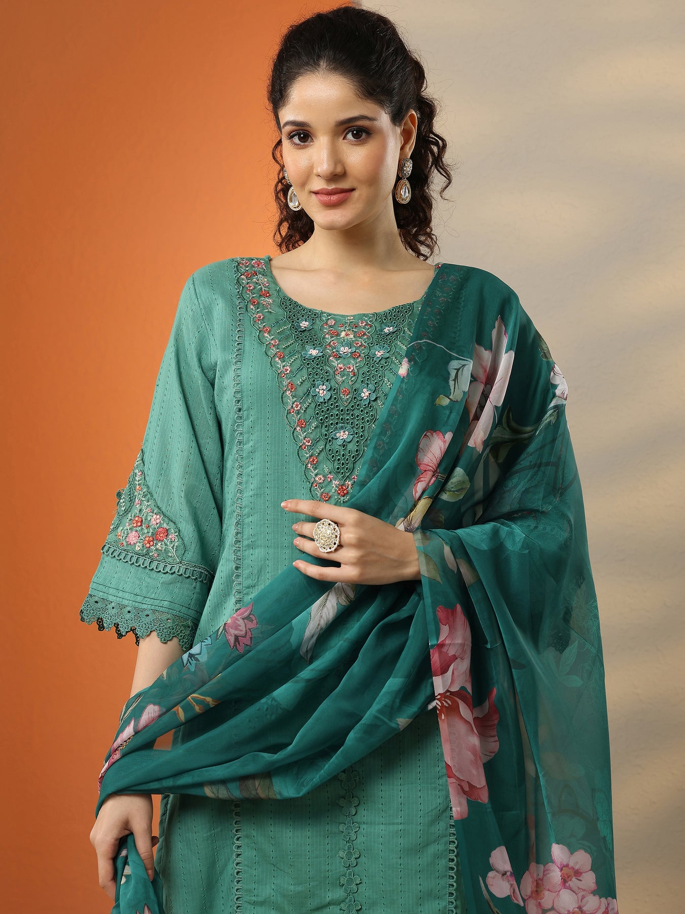 Our 3-piece green cotton straight-fit kurta set features a V-neckline, regular sleeves, and statement yoke. Complemented with straight pants with a partially elasticated waistband and 2 pockets, and a printed dupatta. Adorned with Floral Embroidered, this style is perfect for festive occasions.
