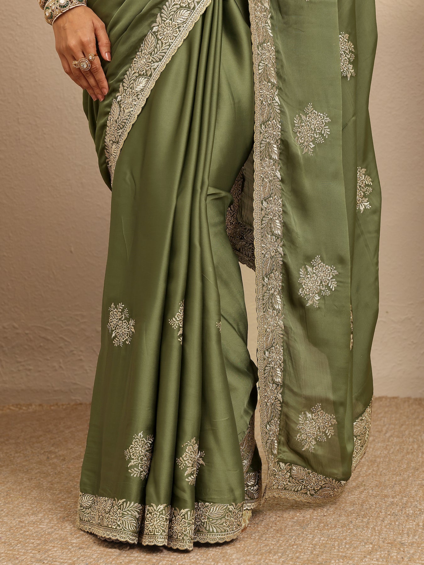 Green Embroidered Silk Blend Saree With Unstitched Blouse Piece