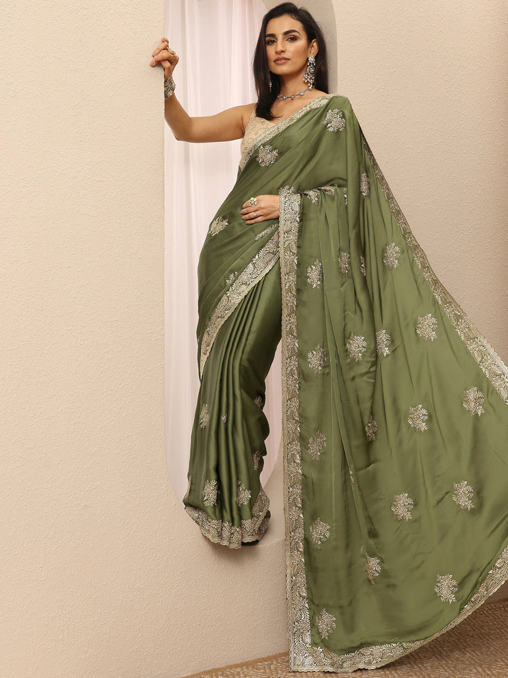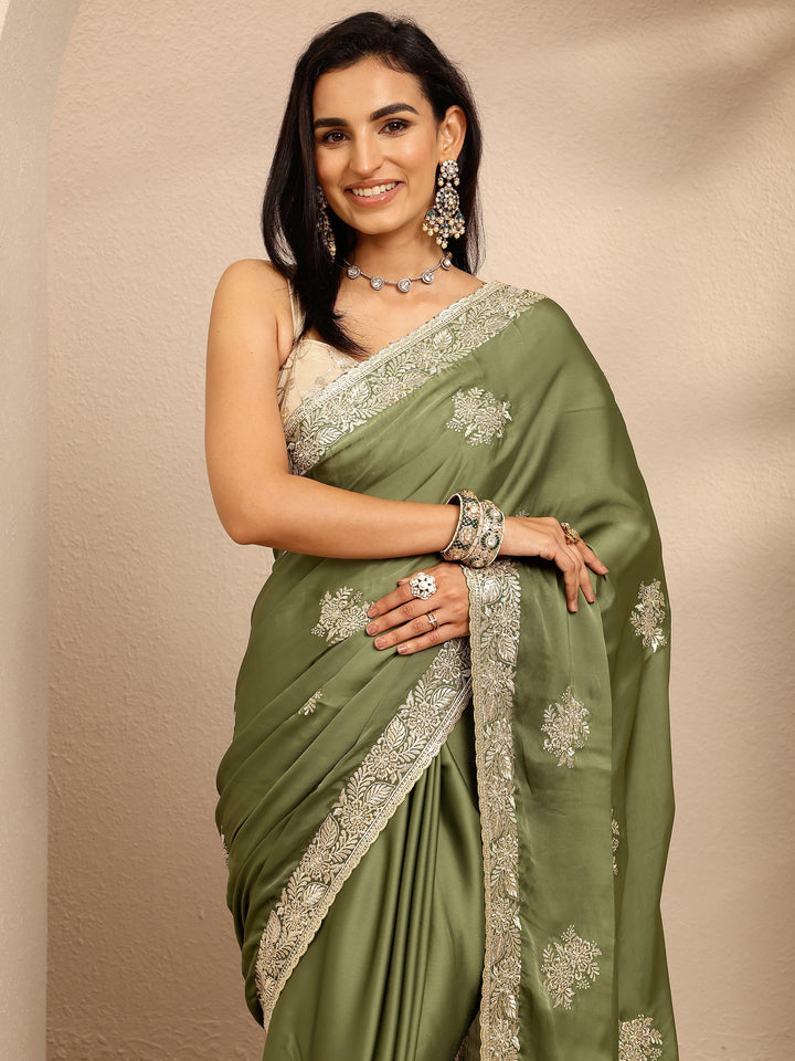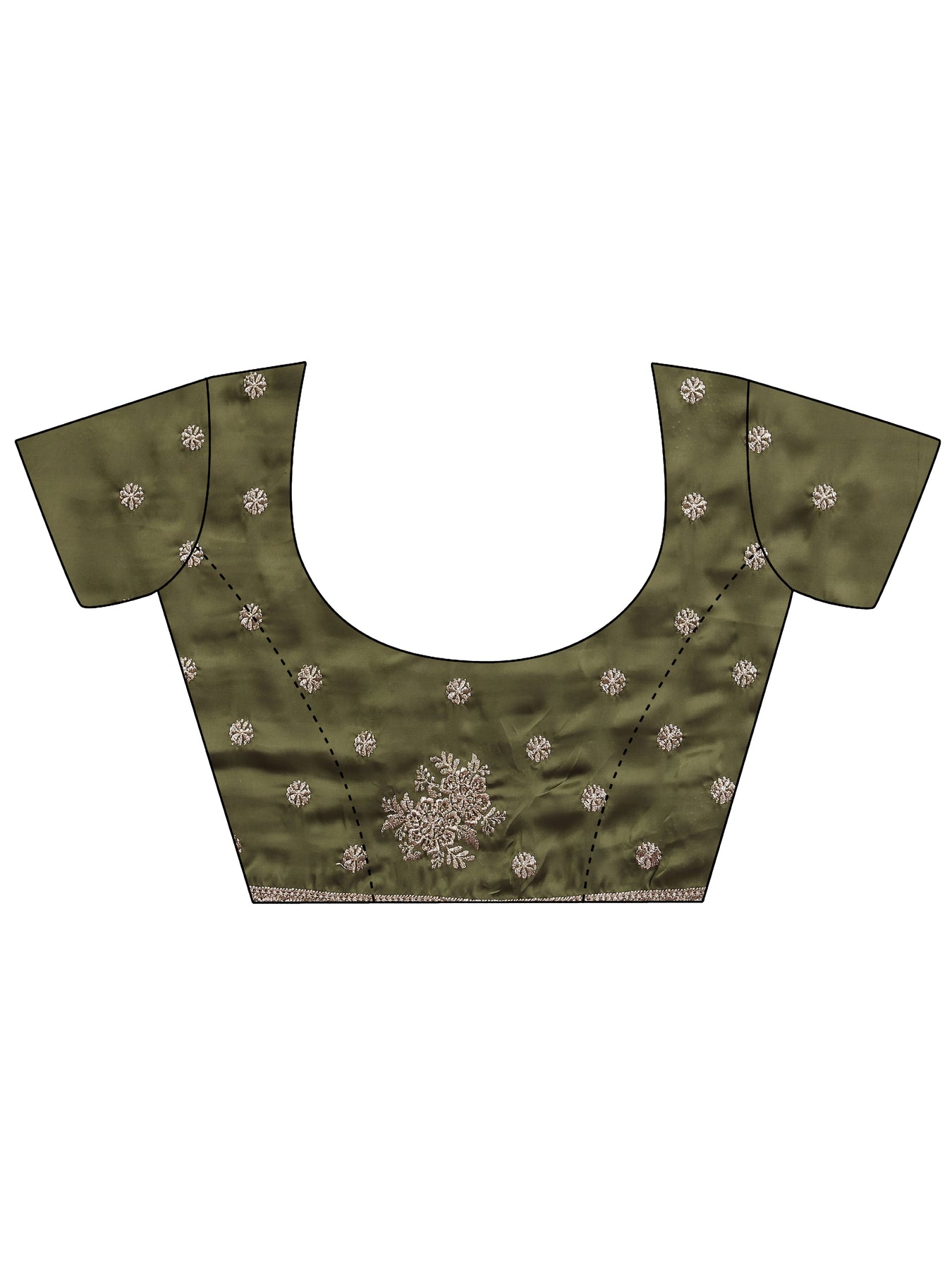 Our olive printed silk blend saree features captivating embellishments. Complemented with a stitched blouse. This charming saree is perfect for festive occasions.