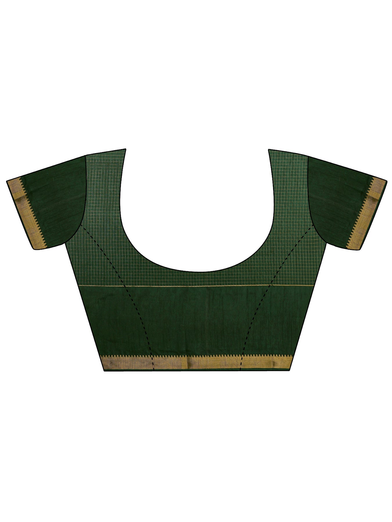 Our green silk-blend saree features a rich, textured finish adorned with elegant gold zari woven motifs and a traditional paisley-patterned border. Complemented with a unstitched blouse, this graceful saree is perfect for festive occasions and traditional celebrations.