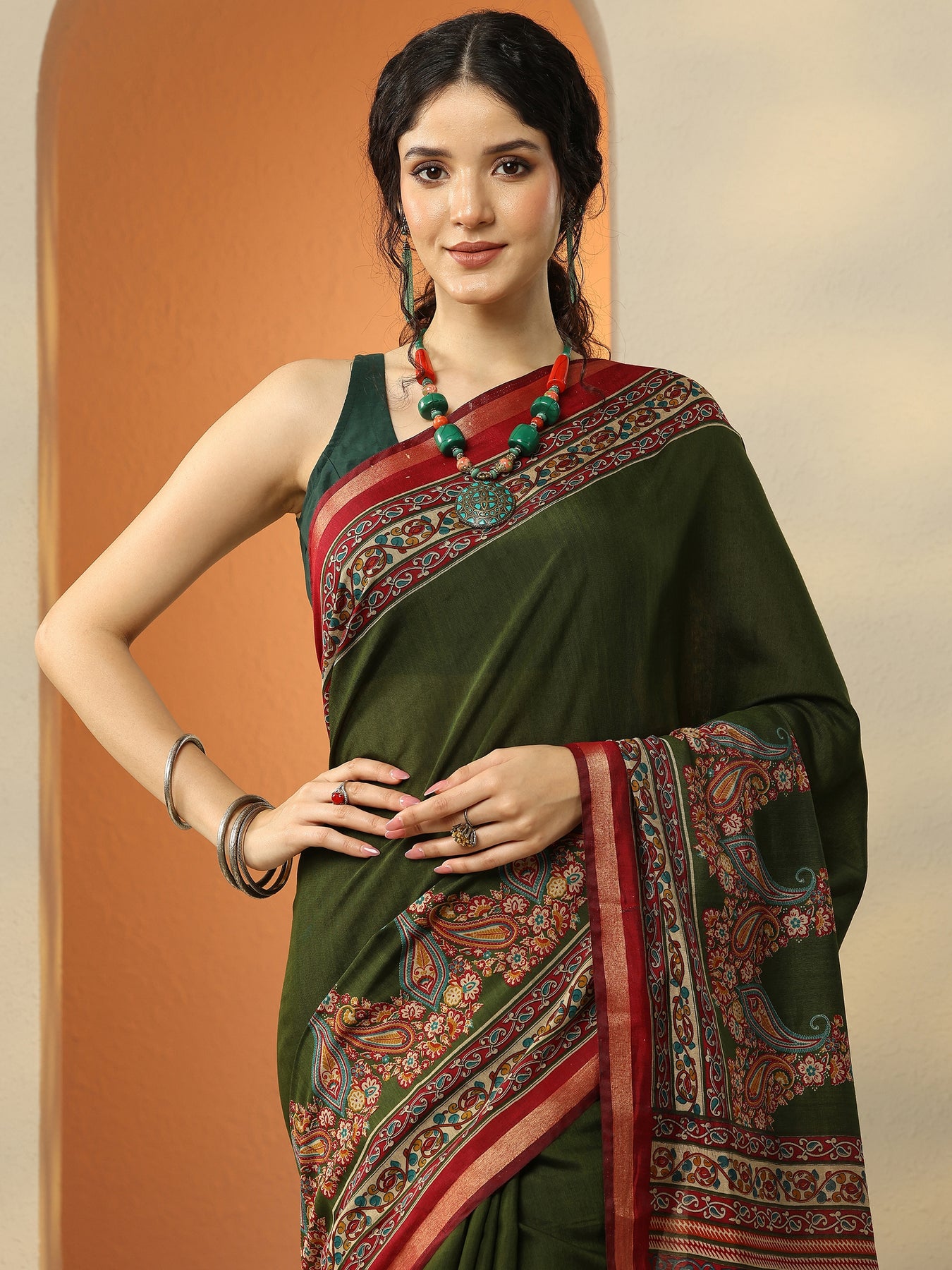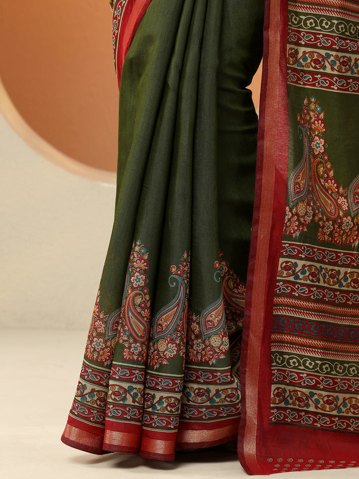 Green Paisley Printed Silk Blend Saree With Unstitched Blouse Piece