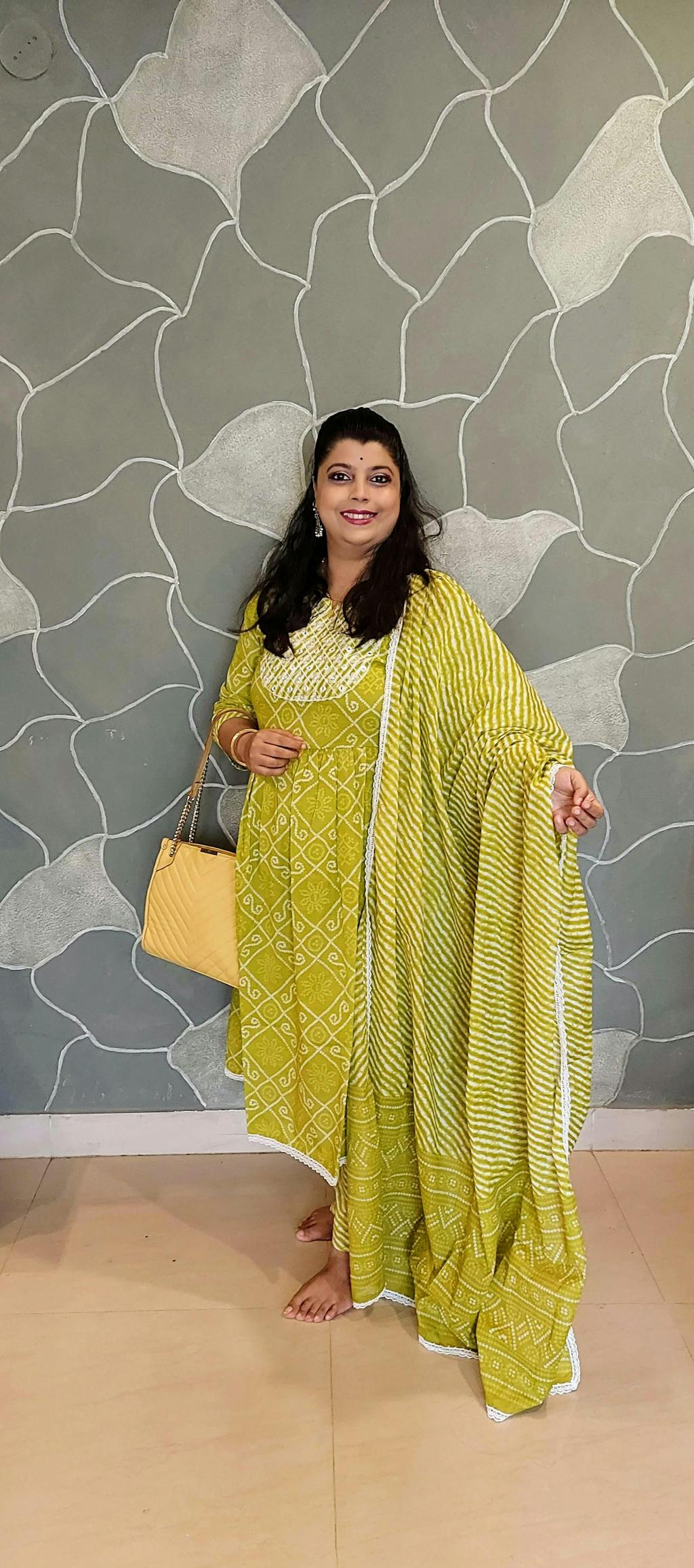 Our 3-piece green cotton suit set highlighted by a Bandhani print features an Anarkali kurta with a notched neckline, three-quarter sleeves, palazzo pants with a partially elasticated waistband and roomy pockets, and a dupatta with contrasting Leheriya print. Adorned with a statement yoke and lace-trim accents, this style is perfect for daytime festivities.