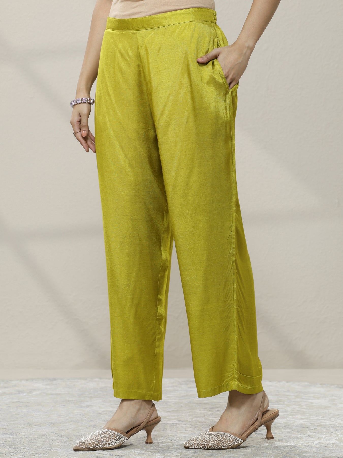 Our 3-piece green organza straight-fit kurta set features a round neckline, regular sleeves, and statement yoke. Complemented with lining and straight pants with a partially elasticated waistband and 2 pockets, and a printed dupatta. Adorned with ethnic motif printed, this style is perfect for festive occasions.