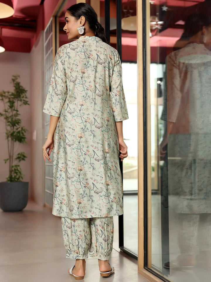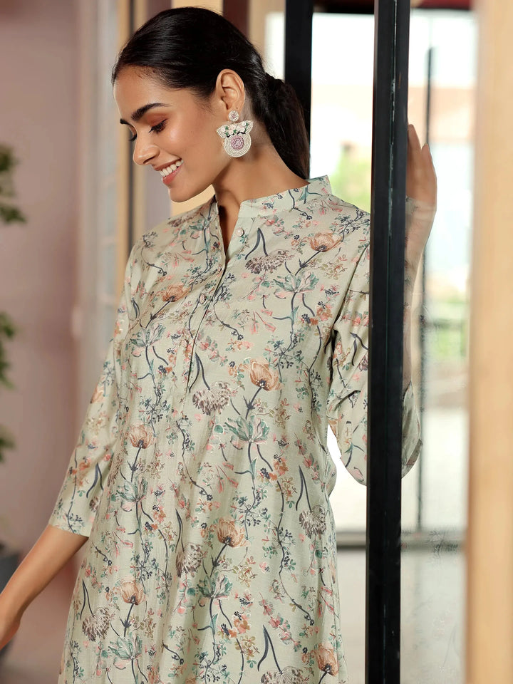 Our 2-piece green printed silk blend co-ord set features a shirt-style flared tunic with three-quarter sleeves. Complemented with matching trousers with a partially elasticated waistband and roomy pockets. Highlighted with stylish button accents and floral patterns, this style is perfect for casual outings.