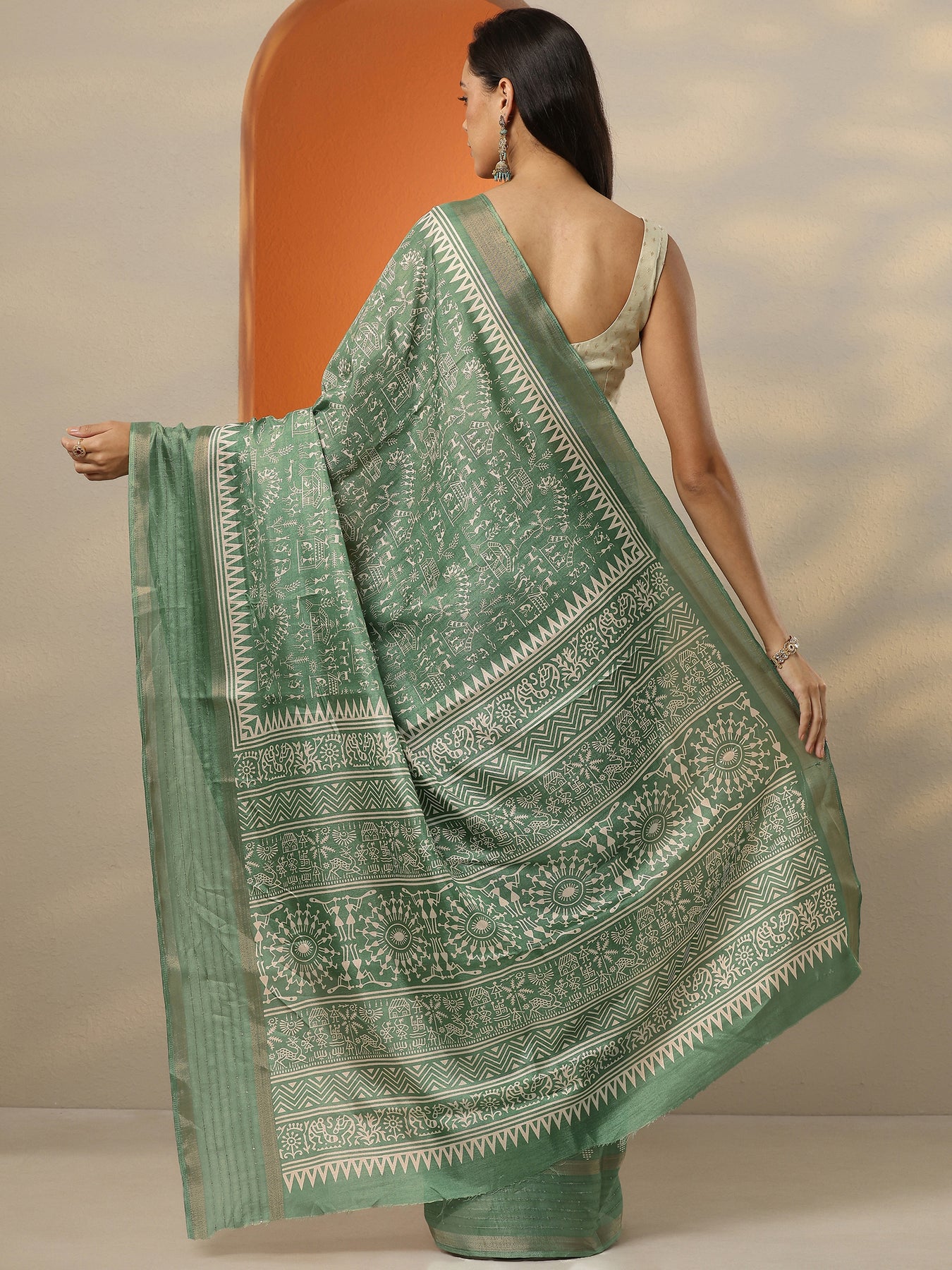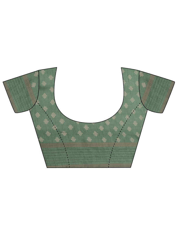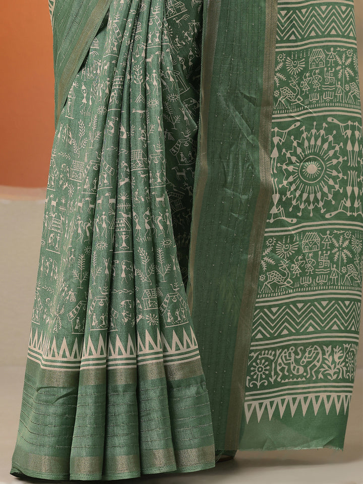Green Printed Silk Blend Saree With Unstitched Blouse Piece