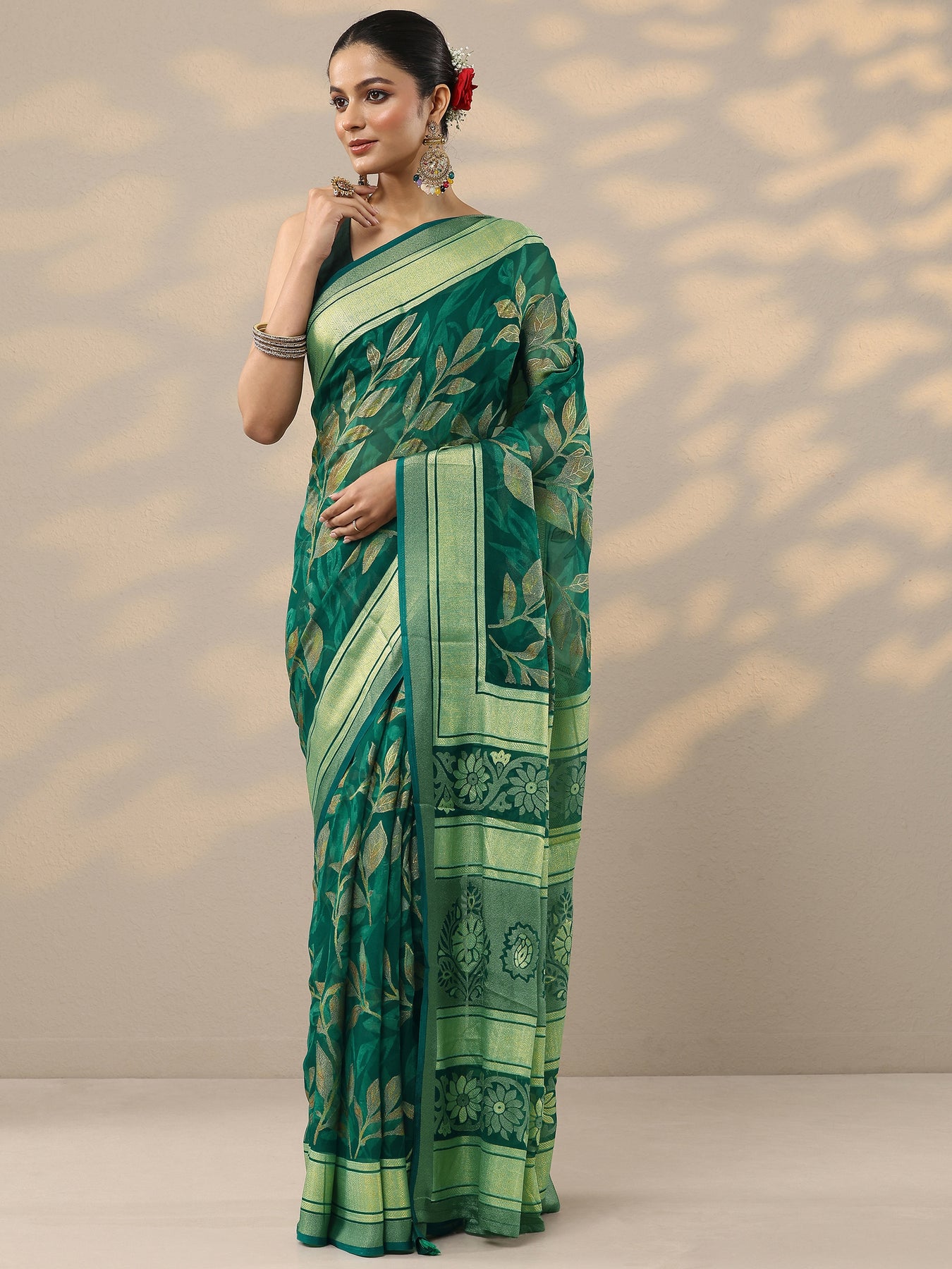 Green Printed Silk Blend Saree With Unstitched Blouse Piece