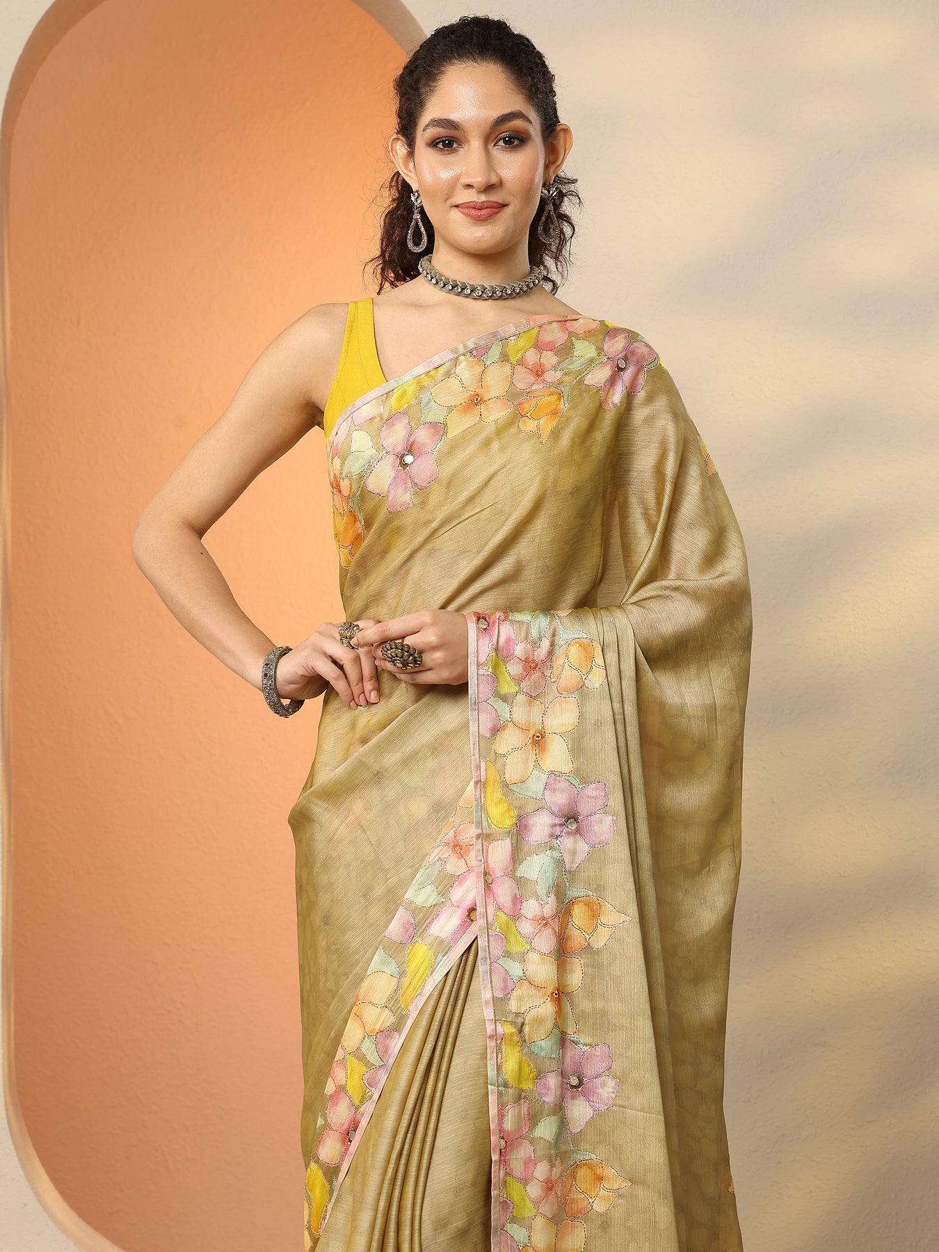 Green Printed Silk Blend Saree With Unstitched Blouse Piece