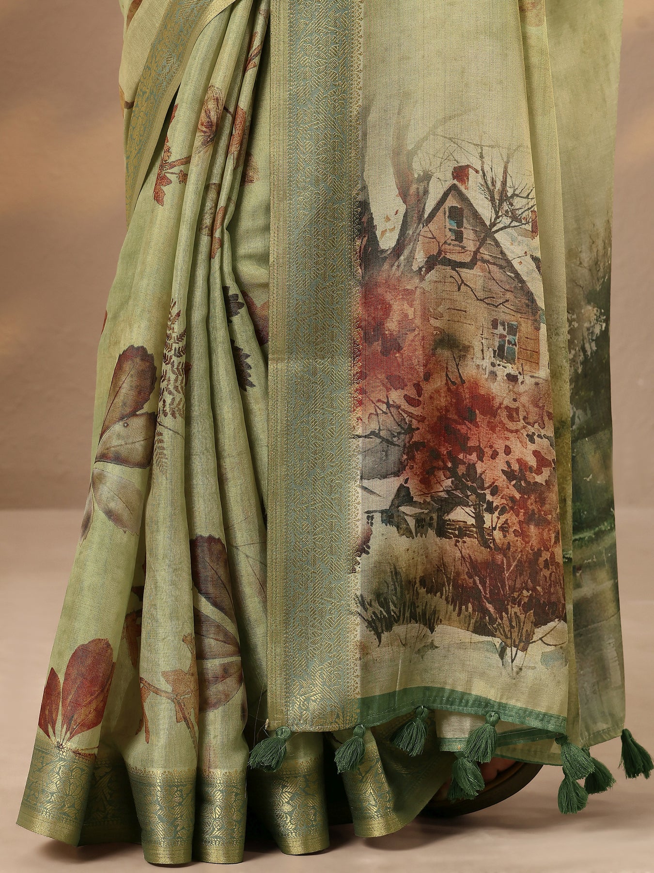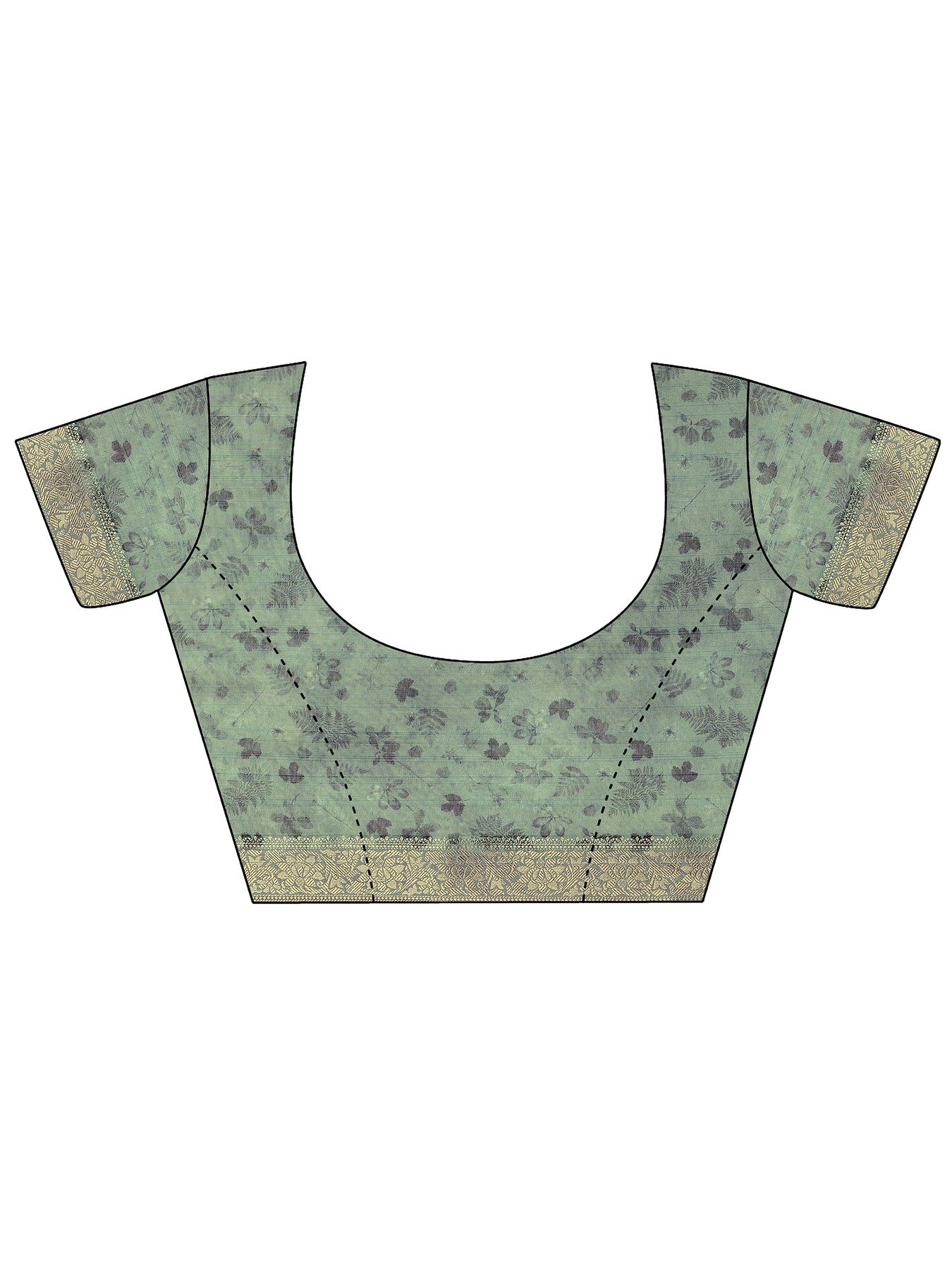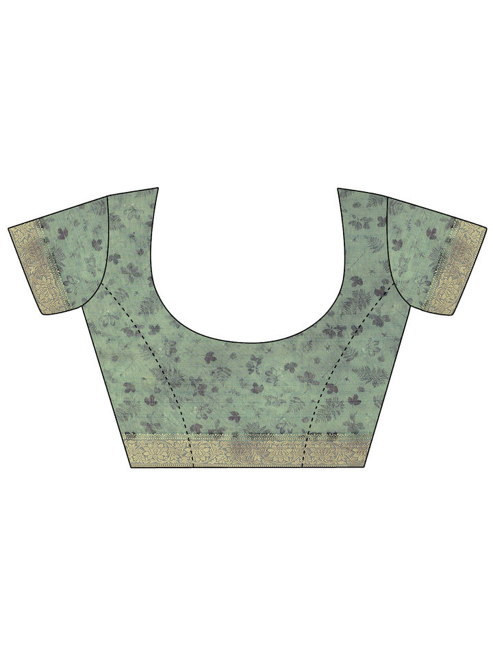 Our Green Printed Silk Blend Saree Features Captivating Floral. Complemented With An Unstitched Blouse Piece. This Charming Saree Is Perfect For Festive Occasions.