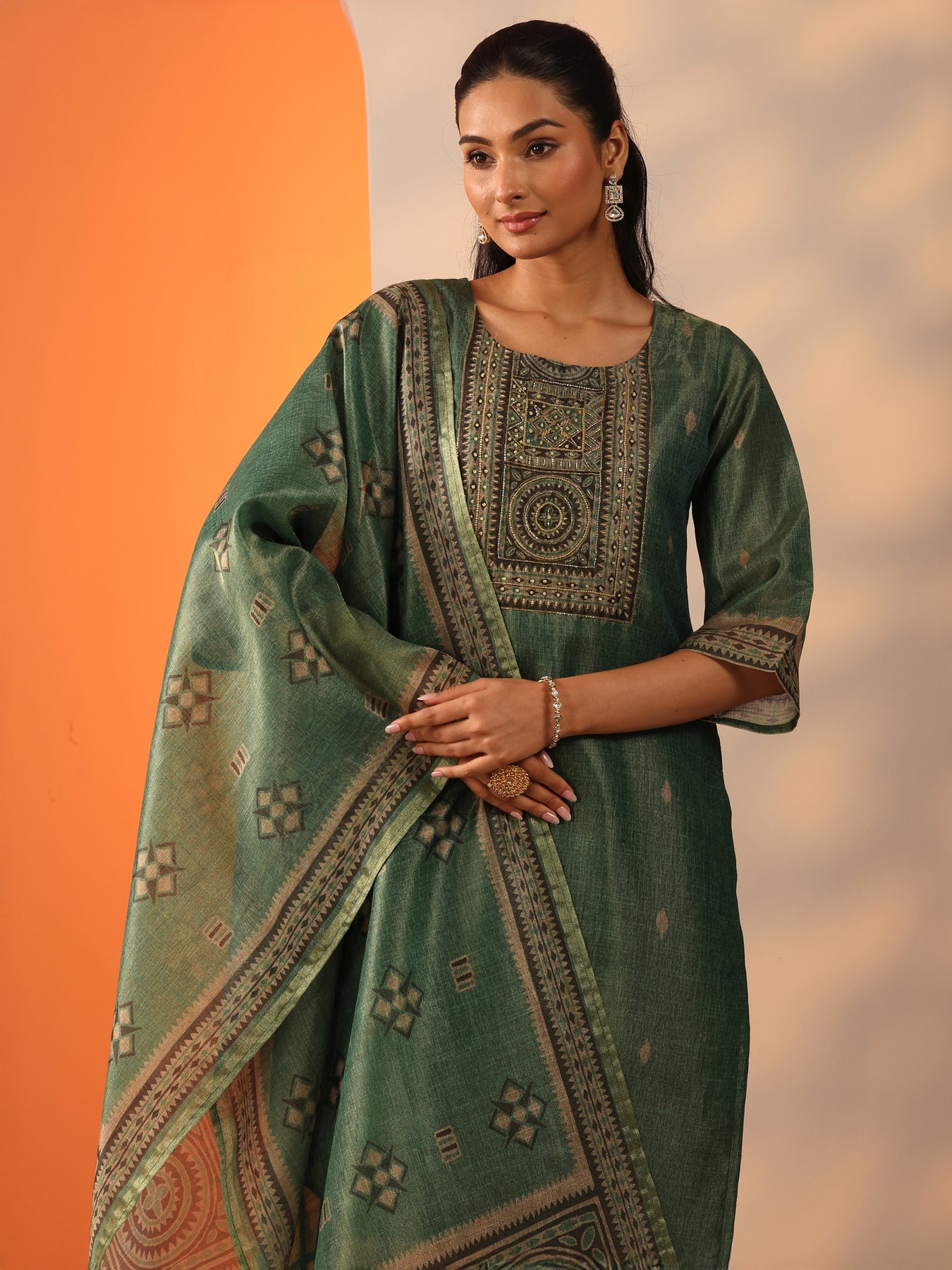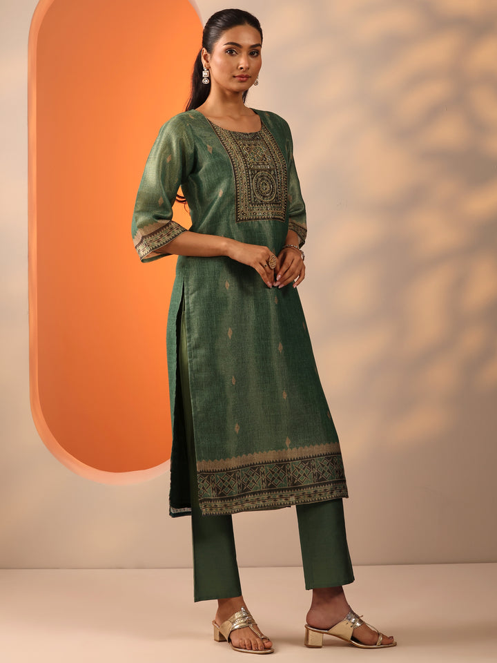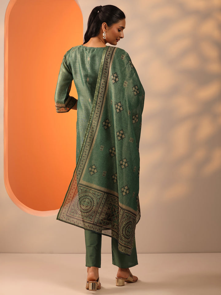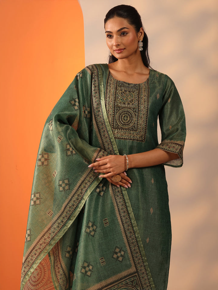 Green Printed Silk Blend Straight Suit Set With Dupatta