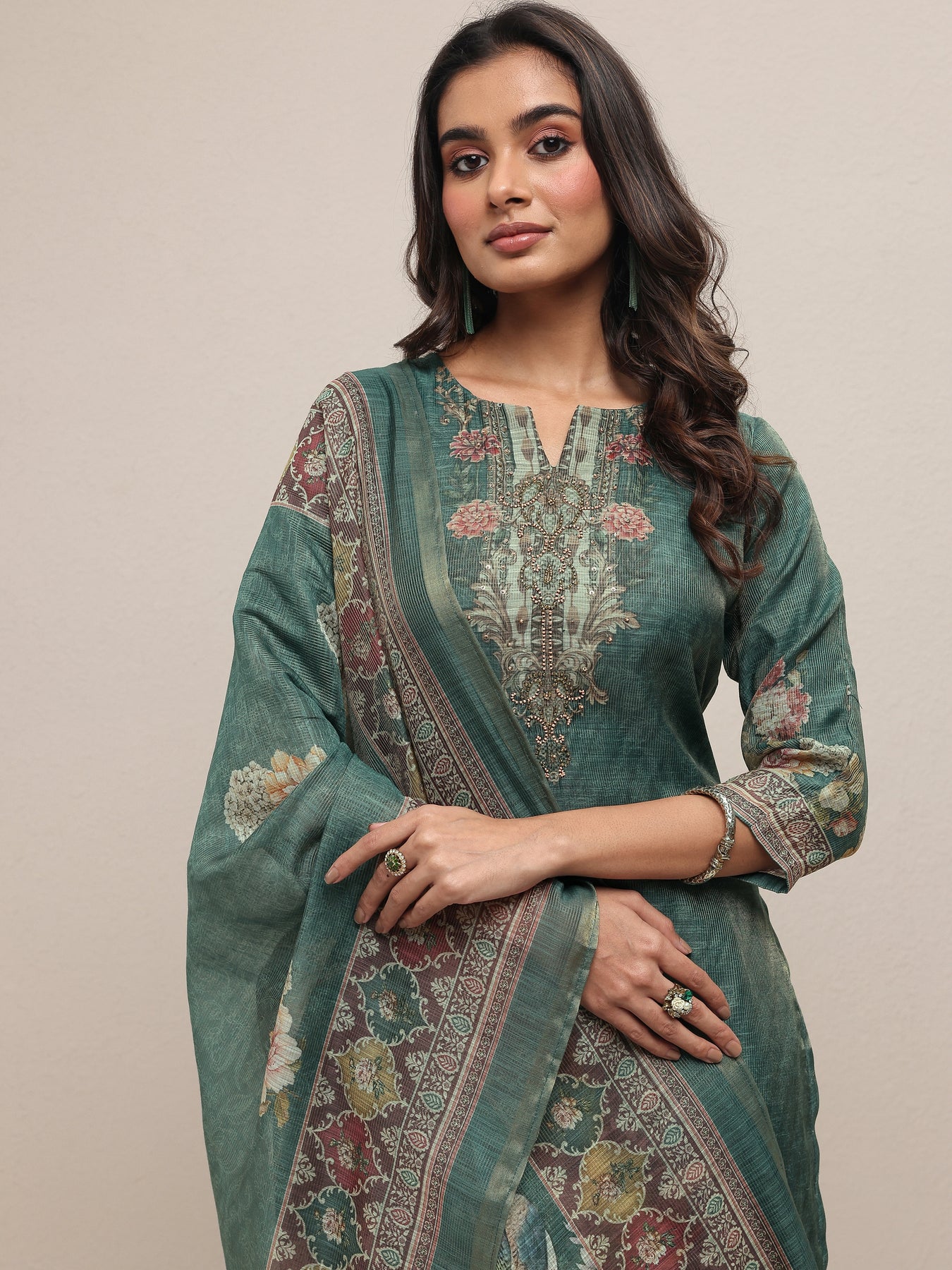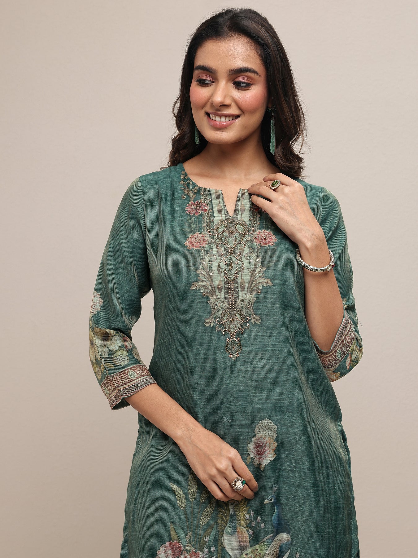 Our 3-piece green silk blend kurta set features a straight-fit kurta with a sweetheart neckline, regular sleeves, and statement yoke. Complemented with straight pants with a partially elasticated waistband and 2 pockets, and a printed dupatta. Adorned with floral printed, this style is perfect for festive occasions.