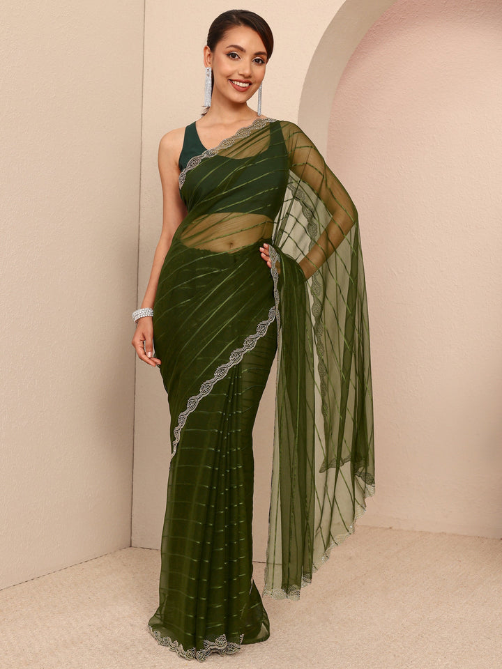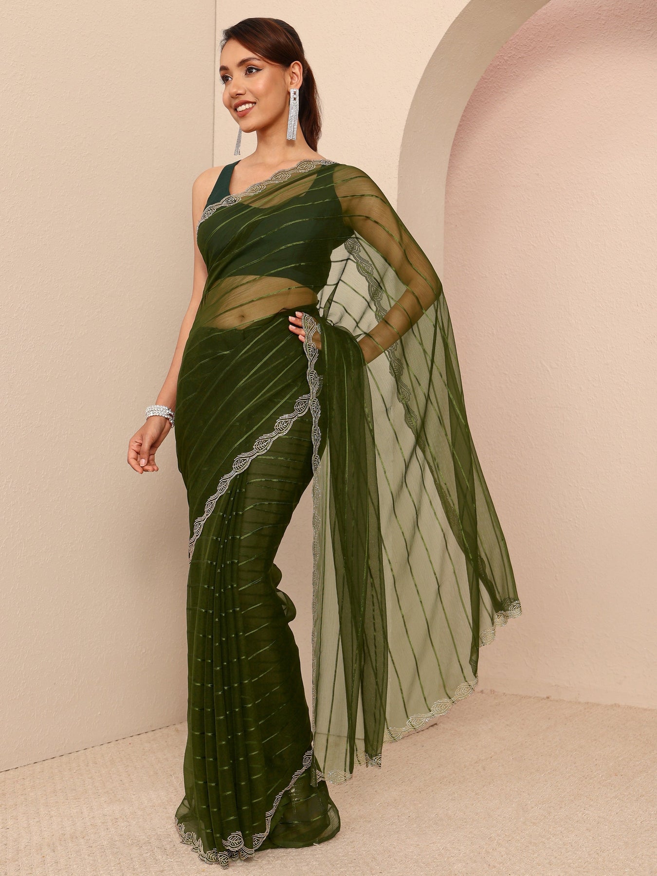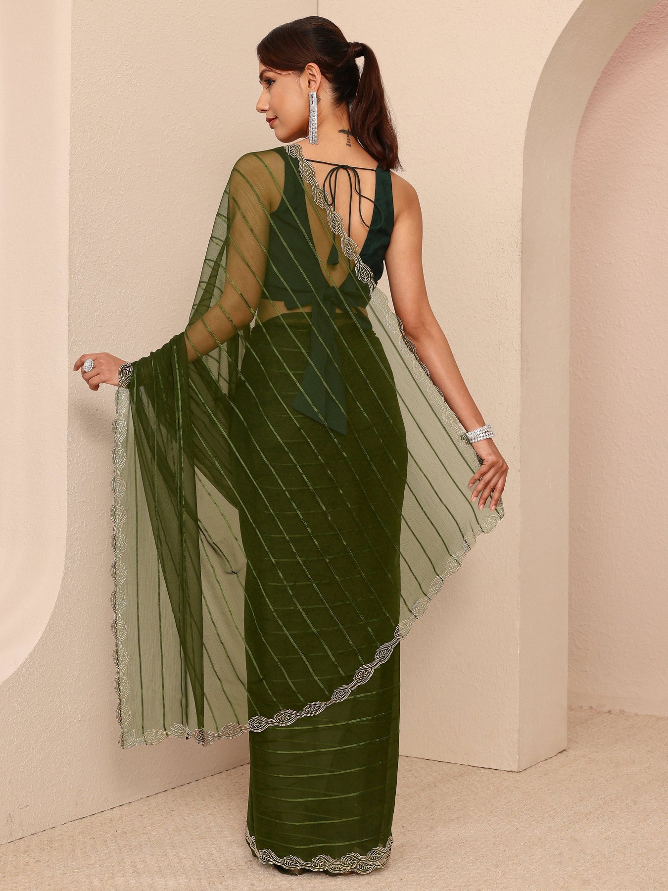 Green Striped Embellished Silk Blend Saree With Unstitched Blouse Piec