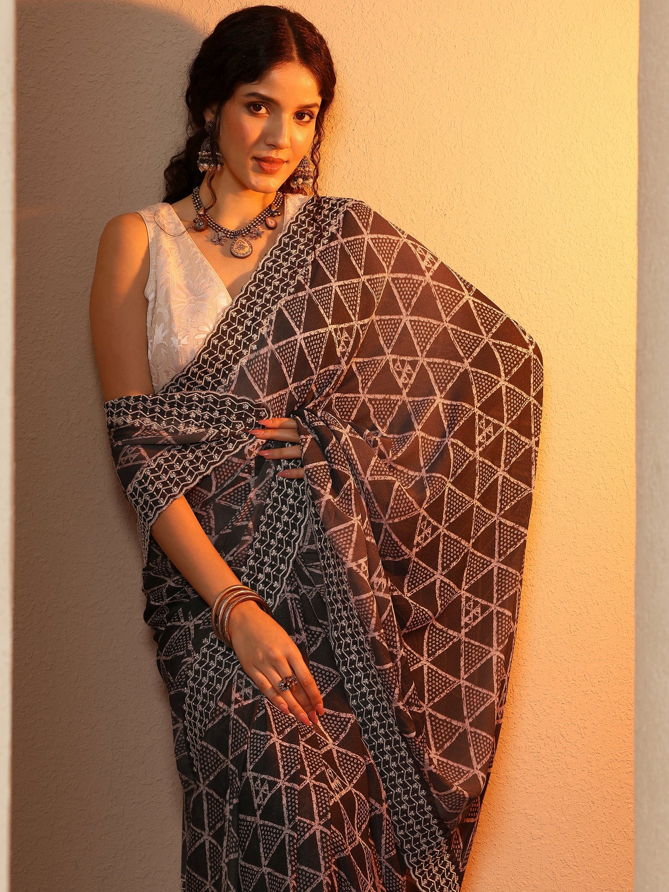 Grey Bandhani Printed Georgette Saree With Unstitched Blouse Piece