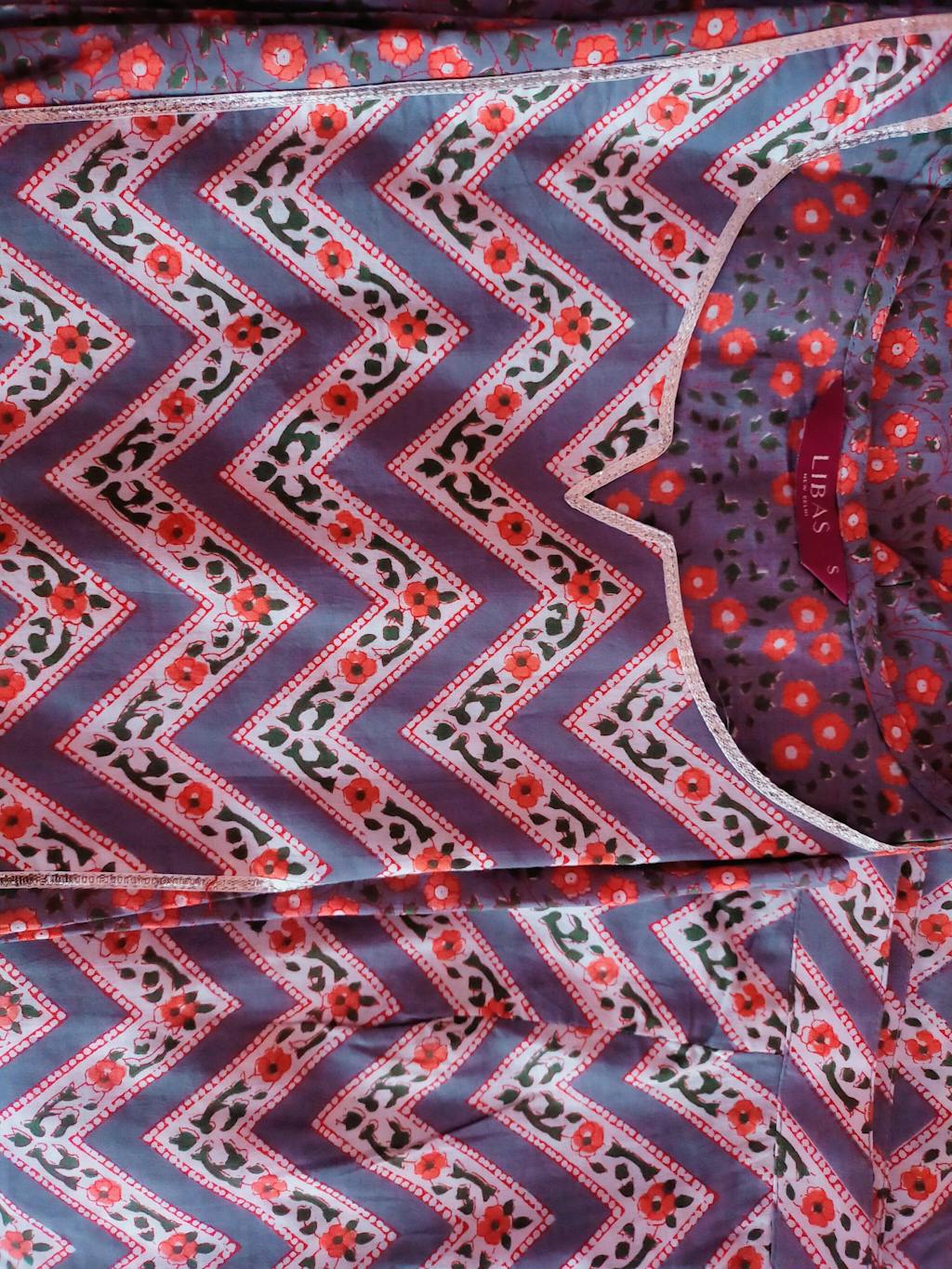 Look beautiful in this grey printed cotton kurta palazzo set, which is a must-have for this summer season. This printed kurta is featuring grey and pink floral printed pattern, chevron print yoke and gotta patti detail with straight cut silhouette and longline side slits. Comes along with Grey and pink chevron print palazzos and cotton stole. Team it with statement jewelry and white flats to complete your look.