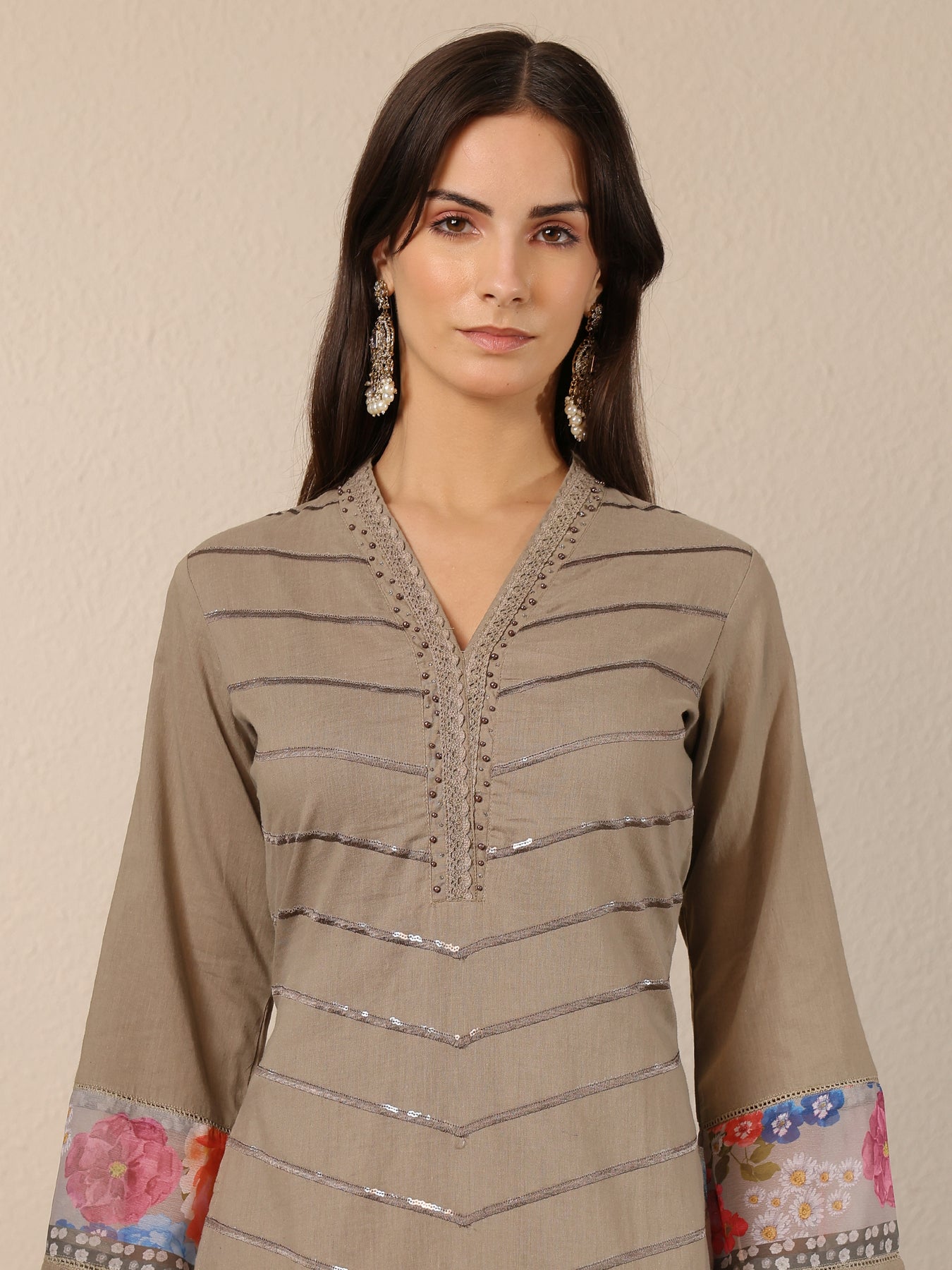 Our 3-piece taupe multi cotton straight-fit kurta set features a V-neckline, regular sleeves, and statement yoke. Complemented with straight pants with a partially elasticated waistband and 2 pockets, and a printed dupatta. Adorned with Embroidered, this style is perfect for work wear and casual wear.