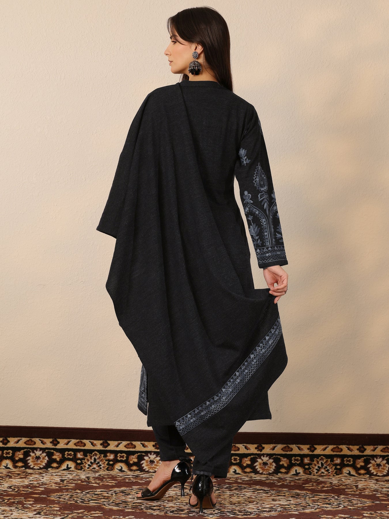 Our 3-piece Black wool Straight-fit Kurta Set features a Mandarin Collar, Regular Sleeves, and statement yoke. Complemented with Straight Pants with a Partially Elasticated waistband and 2 pockets, and an Embroidered dupatta. Adorned with Floral Embroidered, this style is perfect for Dark Festive.