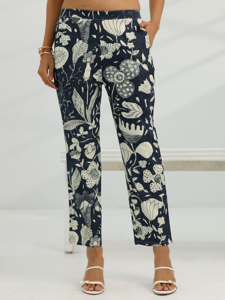 Our 2-piece Navy Blue Cotton Straight-fit Kurta Set features a V-Neckline, Regular Sleeves, and statement Yoke. Complemented with Straight Pants with a Partially Elasticated waistband and 2 pockets. Adorned with Ethnic Motif Printed Floral accents, this style is perfect for Casual wear.