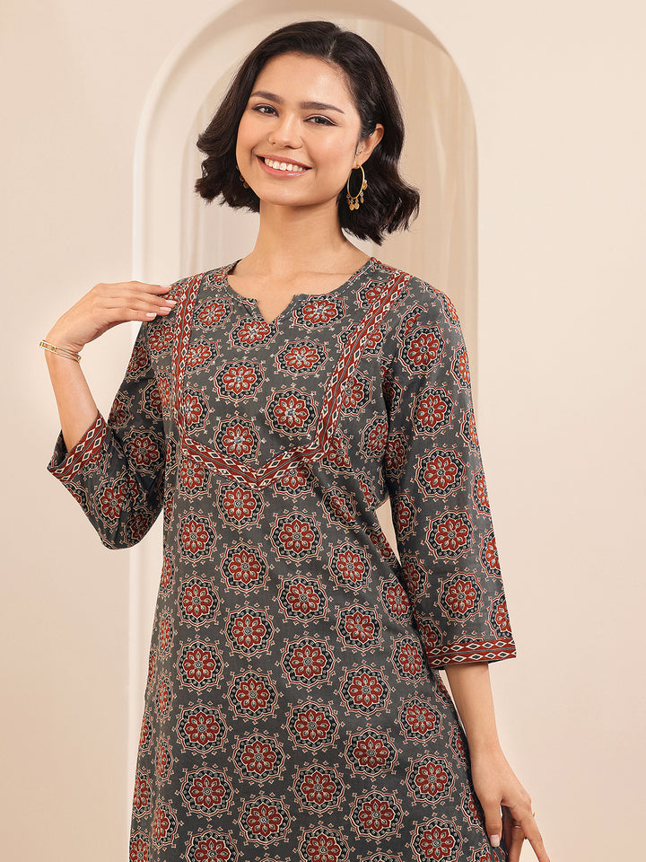 Grey Printed Cotton Straight Suit Sets With Dupatta