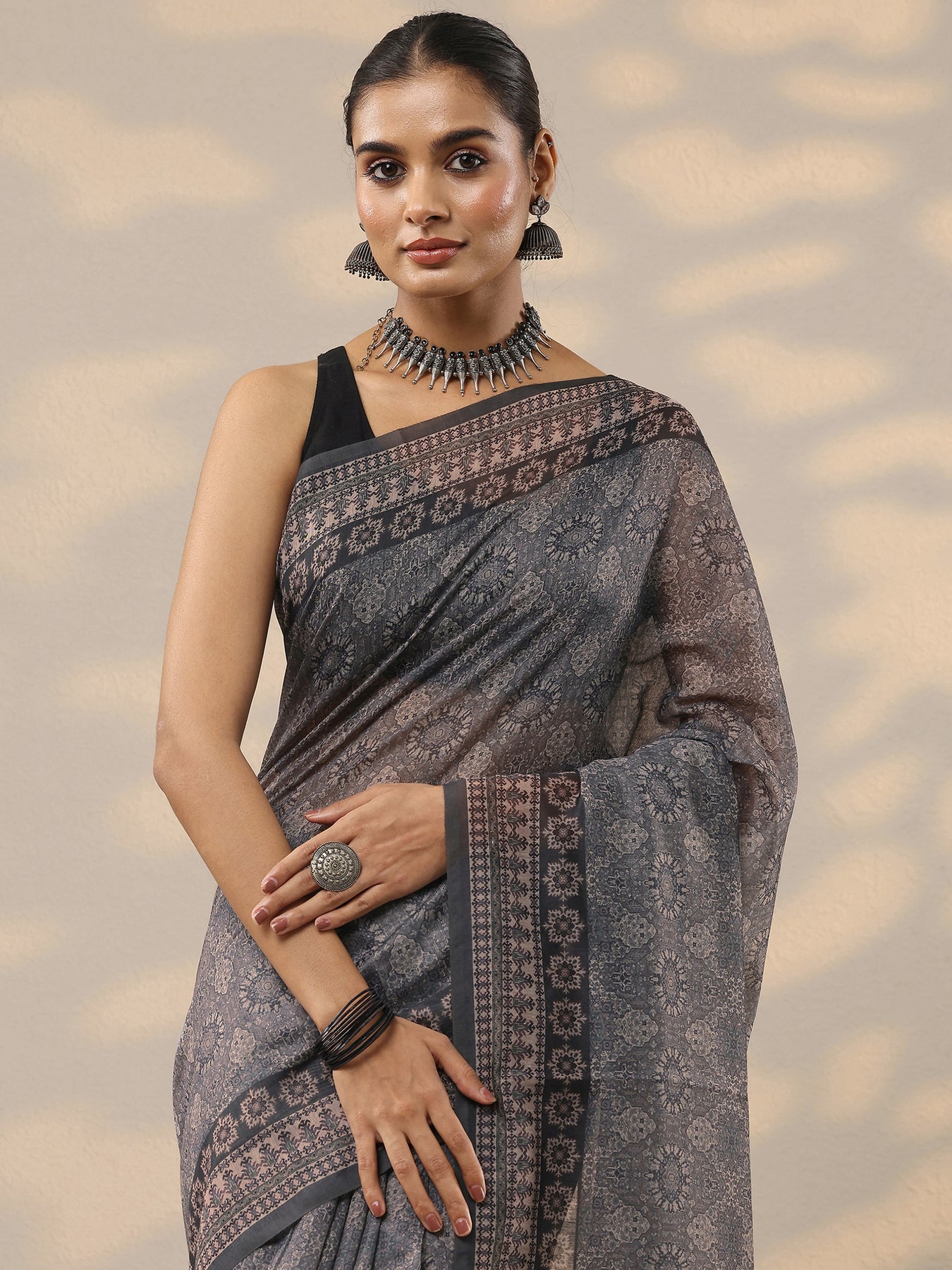 Grey  Printed Silk Blend Saree With Unstitched Blouse Piece