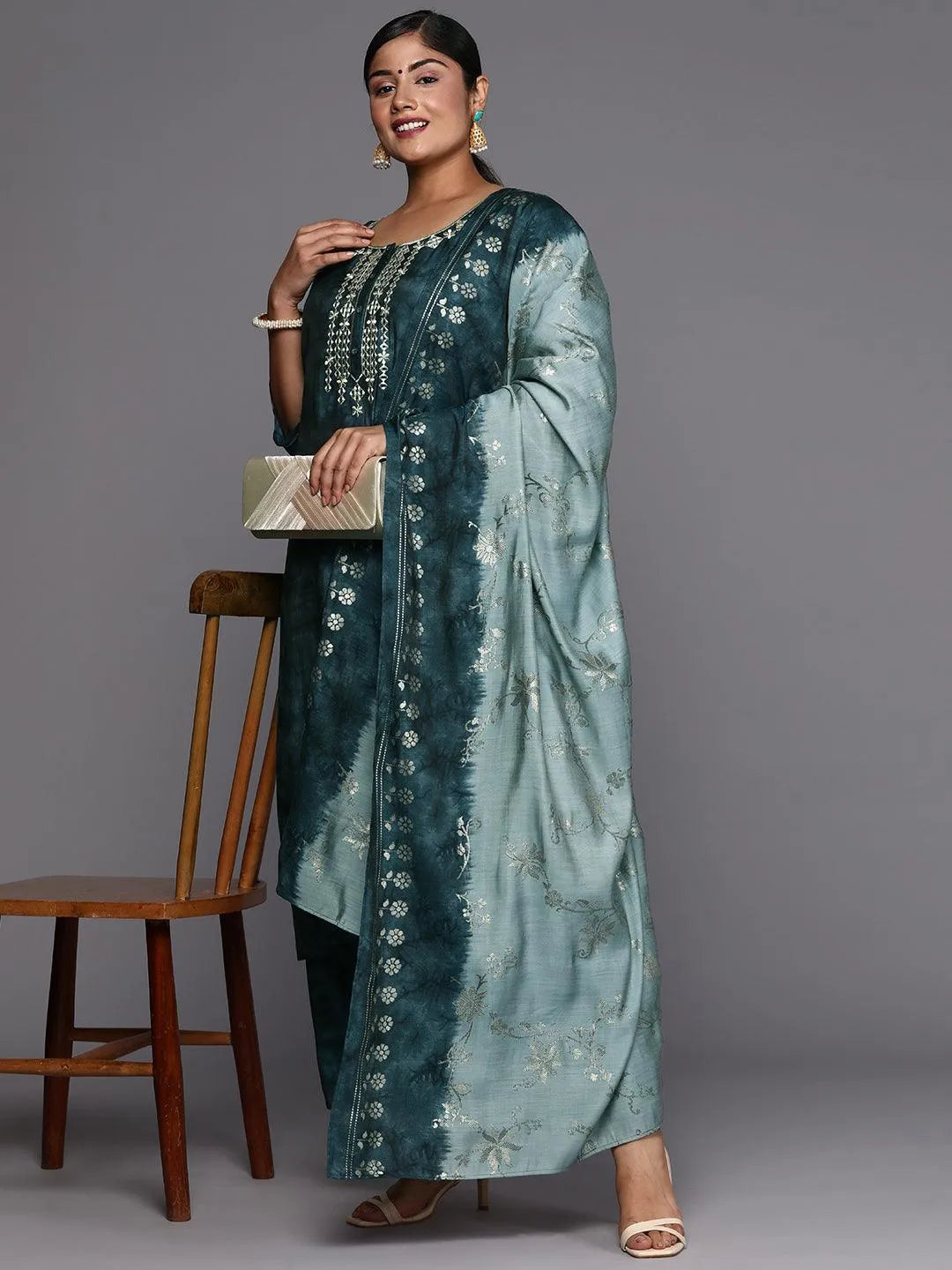 Libas Extra Love collection features our signature designs in comfortable plus sizes. Our 3-piece grey tie and dye print silk blend suit set features a straight-fit kurta with a round neckline, three-quarter sleeves, and a statement yoke. Complemented with palazzos with a partially elasticated waistband and roomy pockets, and an ombre-dyed dupatta. Adorned with mirror and thread work, button accents, and Gota Patti detailing, this style is perfect for light festivities.