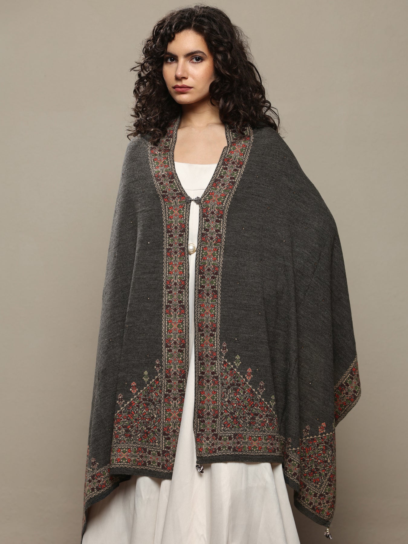 Charcoal woolen shawl featuring intricate embroidered patterns inspired by traditional heritage motifs. Designed to keep you warm and stylish, this versatile wrap pairs effortlessly with your winter ethnic look or drape it with your festive saree for special occasions. Tailored with detailed embroidered borders, this shawl ensures both comfort and elegance in every drape. The shawl also includes a hook closure for enhanced usability.