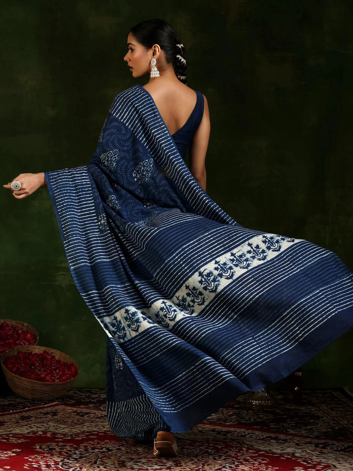 Indigo Printed Cotton Saree With Unstitched Blouse Piece