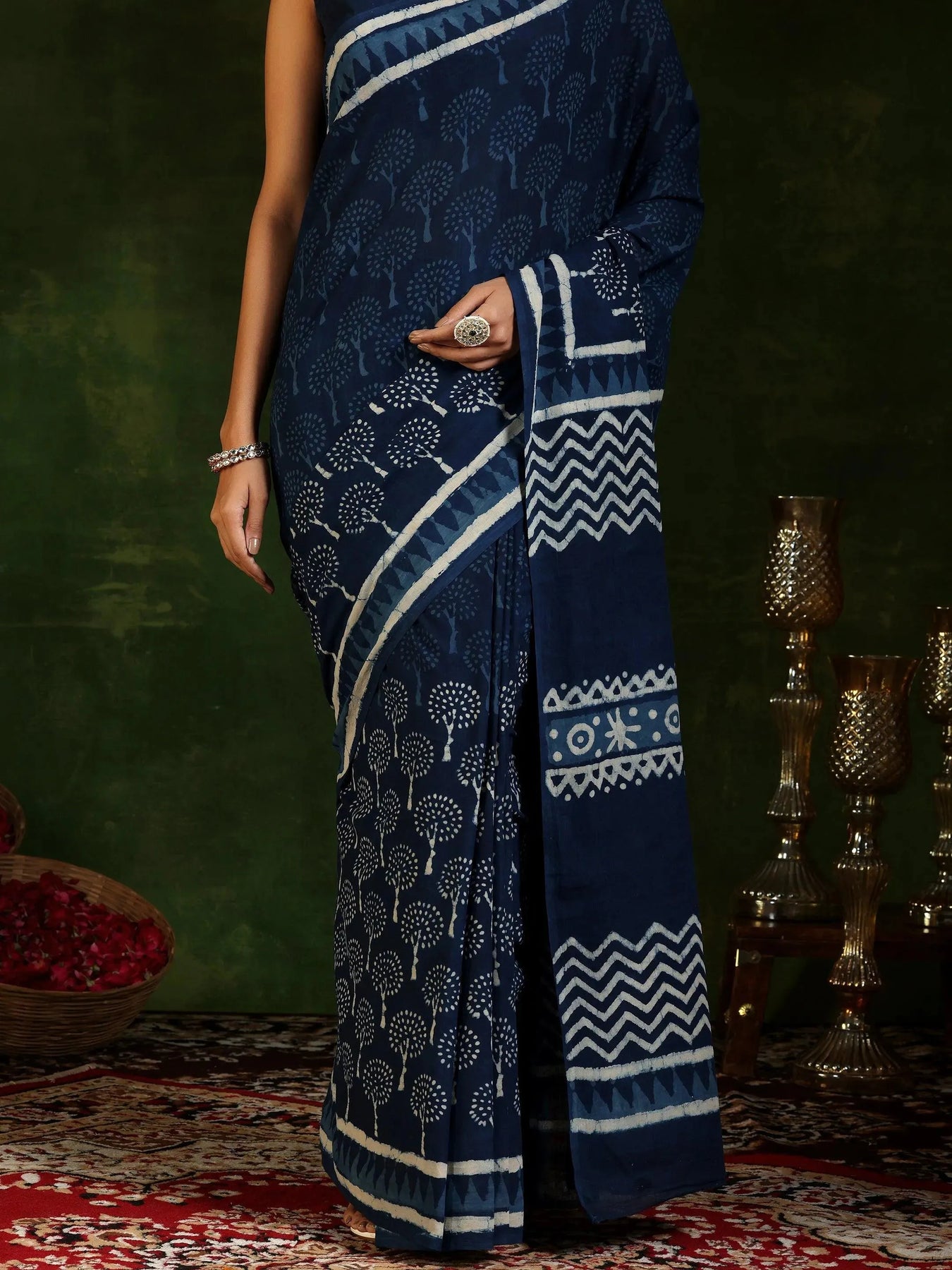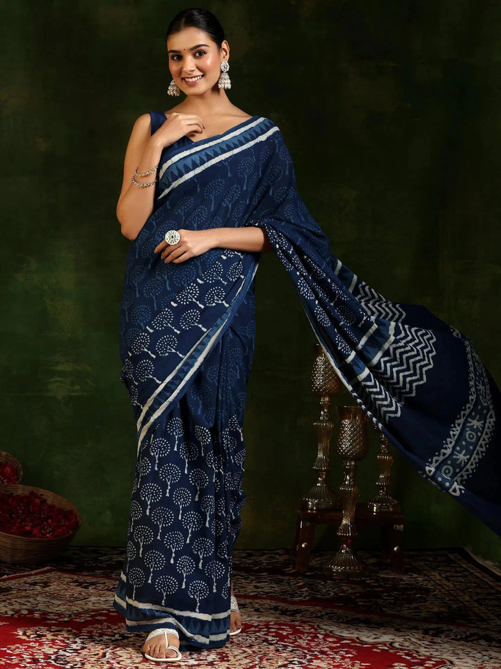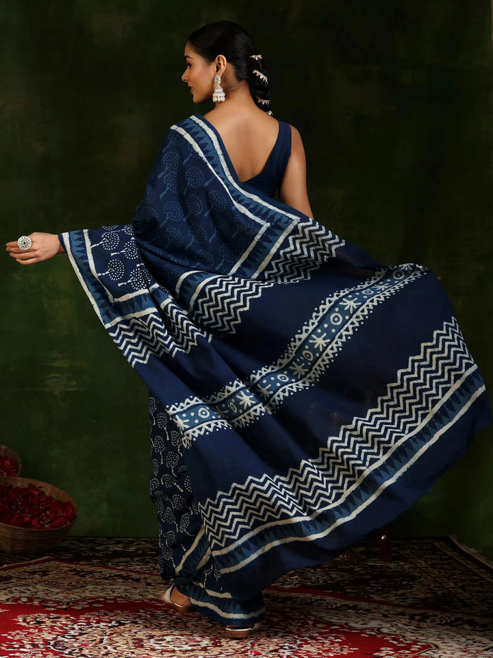 Indigo Printed Cotton Saree With Unstitched Blouse Piece