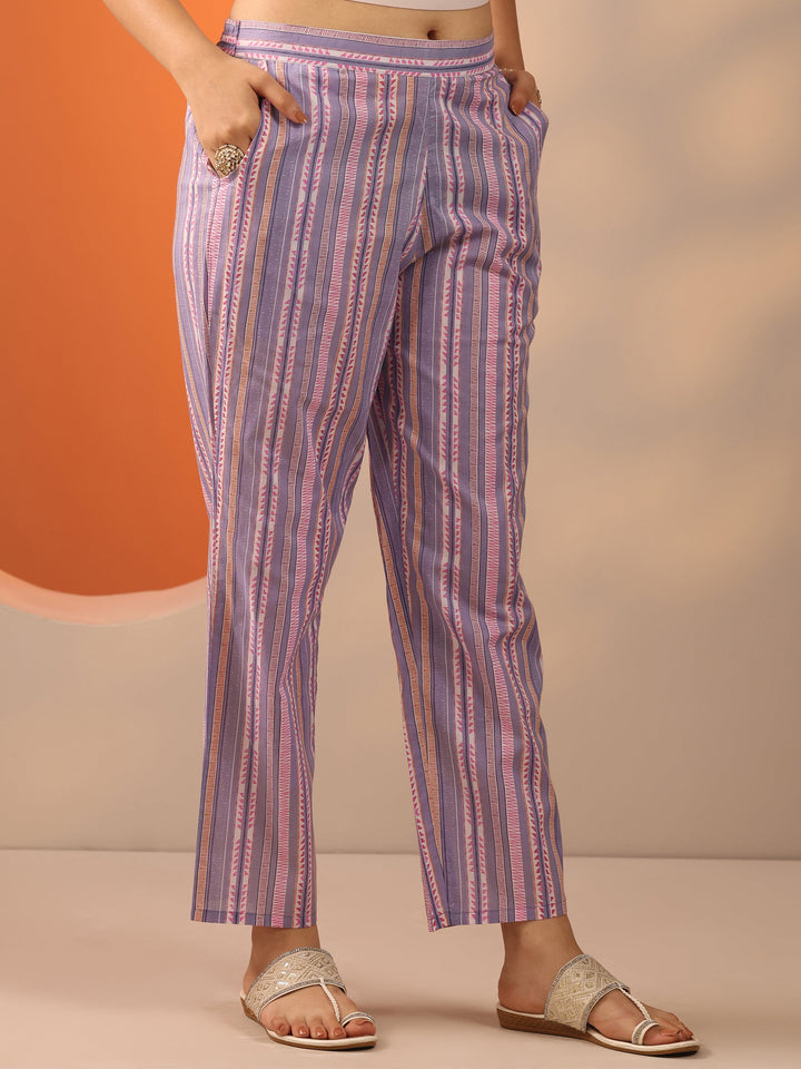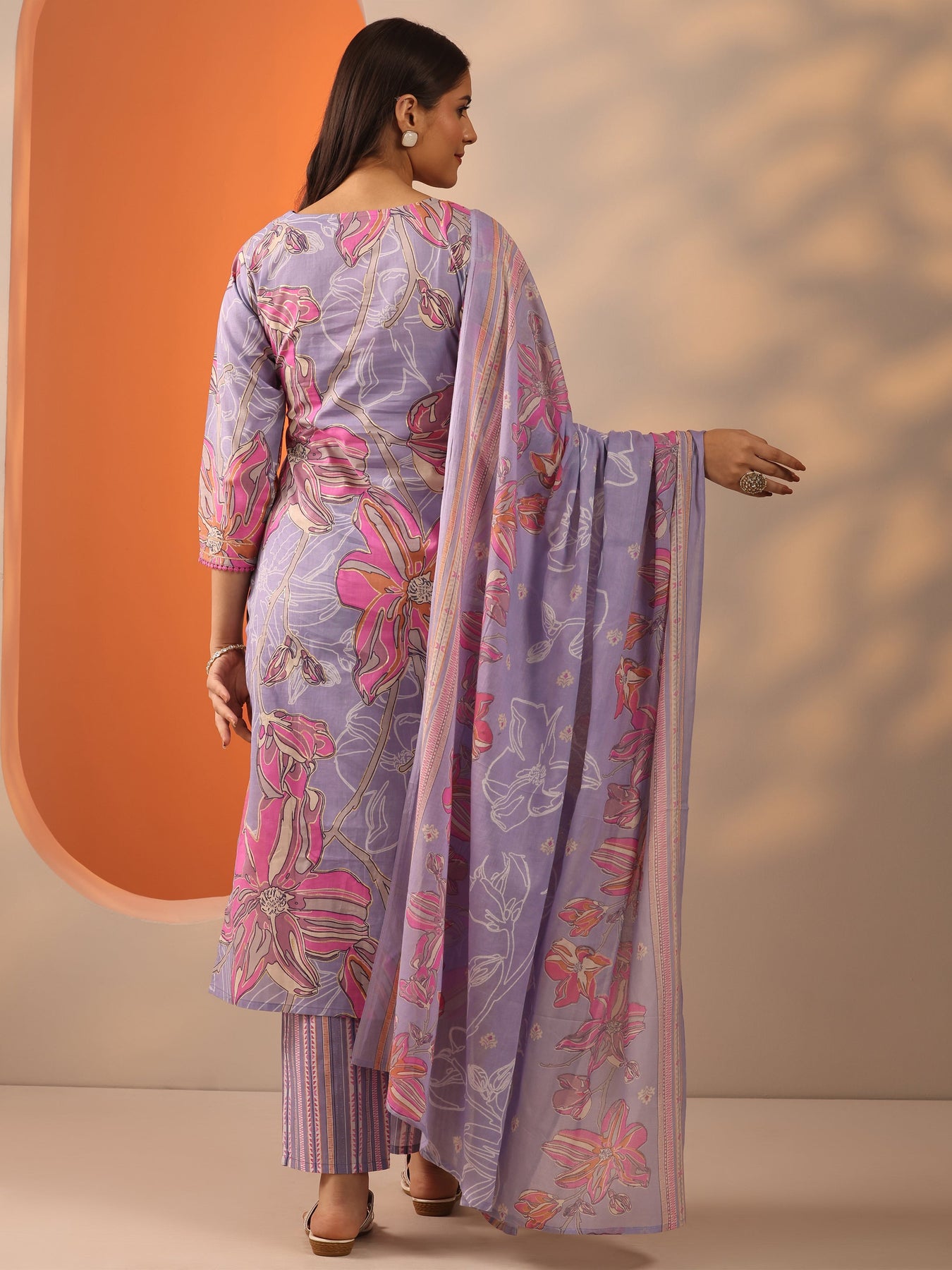 Lavender Printed Cotton Straight Suit Set With Dupatta