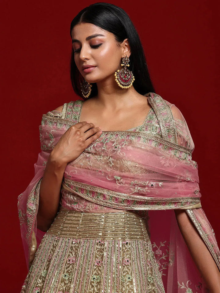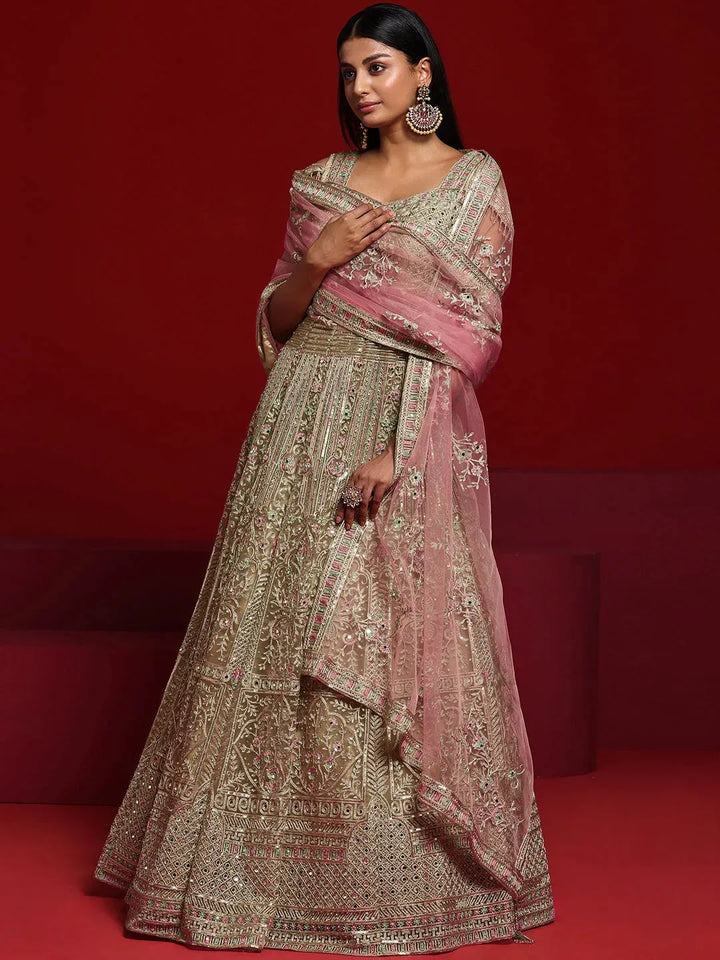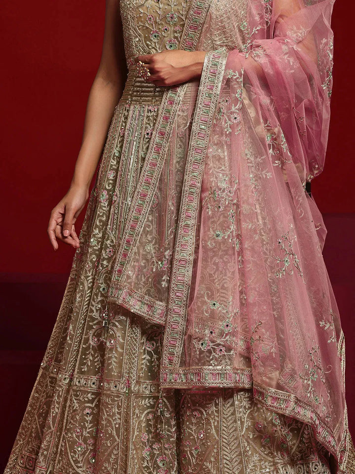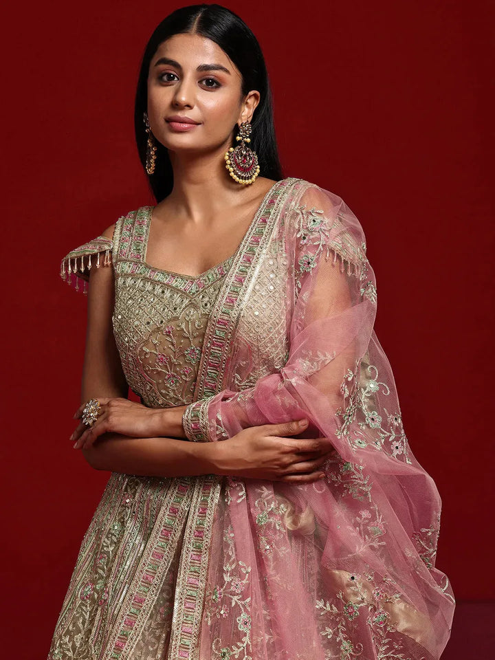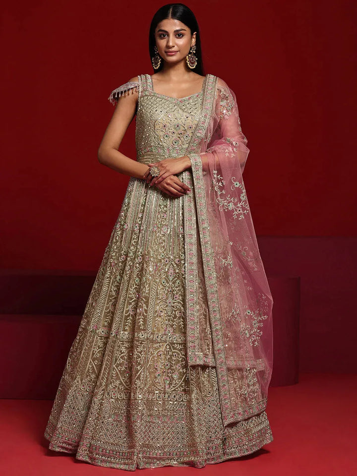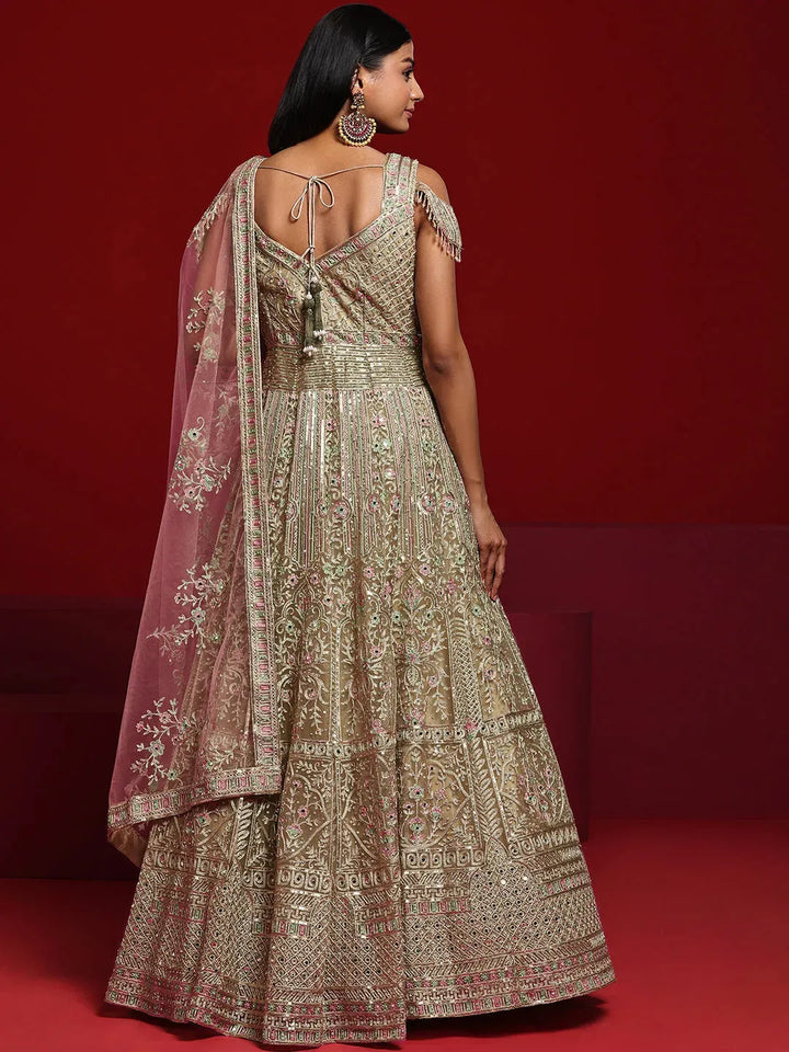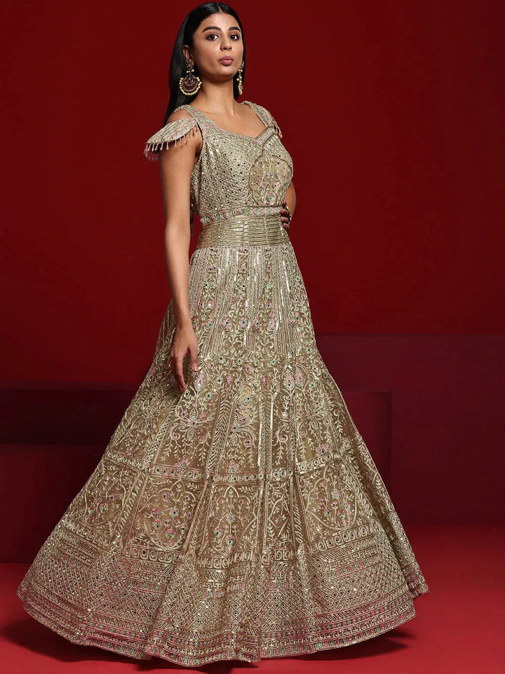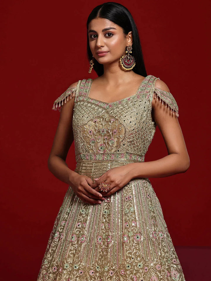 Our 2-piece beige embroidered nylon gown dress features a sweetheart neckline and cold-shoulders. Complemented with a dupatta. Adorned with intricate thread work, mirror accents, sequins, and tassels, this style is perfect for festive celebrations.