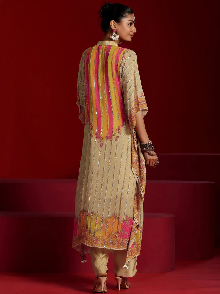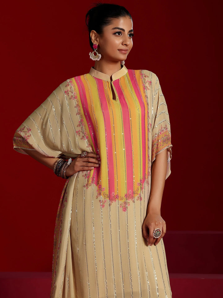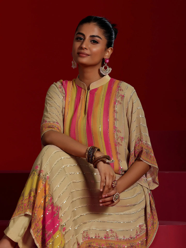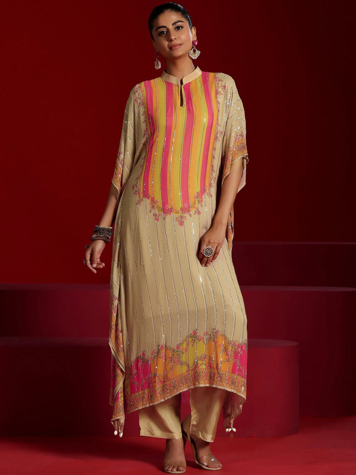 Our 2-piece Beige printed Poly Georgette co-ord set features an Asymmetric Hemline Tunic with a Mandarin Collar neckline and Three-quarter sleeves. Complemented with matching Palazzos with an Elasticated waistband. Highlighted with Printed, this style is perfect for Festive.