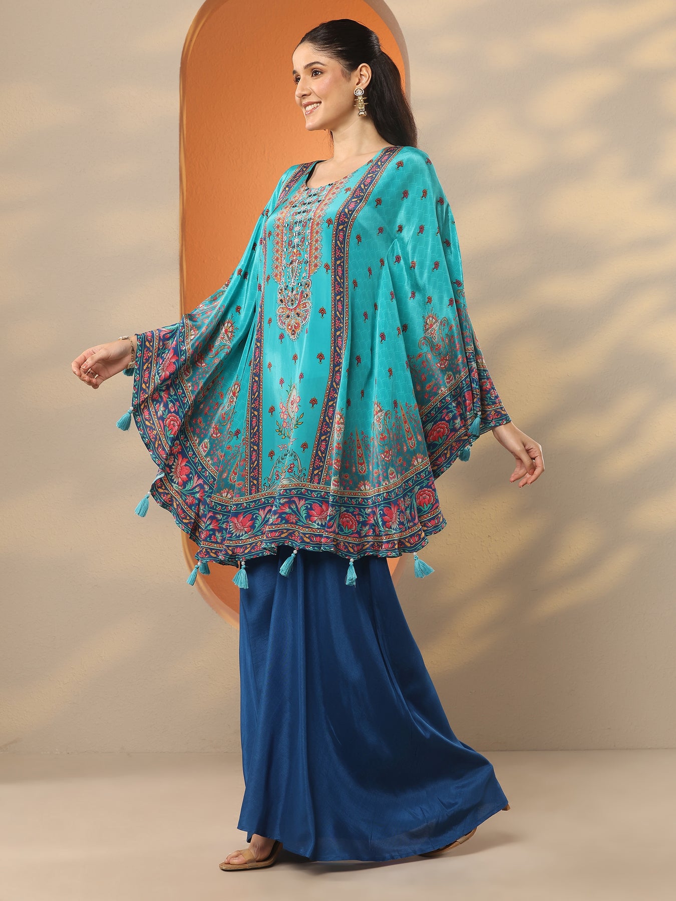 Our 2-piece Turquoise Blue Crepe Straight-Fit features a Round Neckline, Flared Sleeves, and statement yoke. Complemented with Palazzo Pants with a Partially Elasticated waistband. Adorned with Ethnic motif, this style is perfect for Festive occasions.