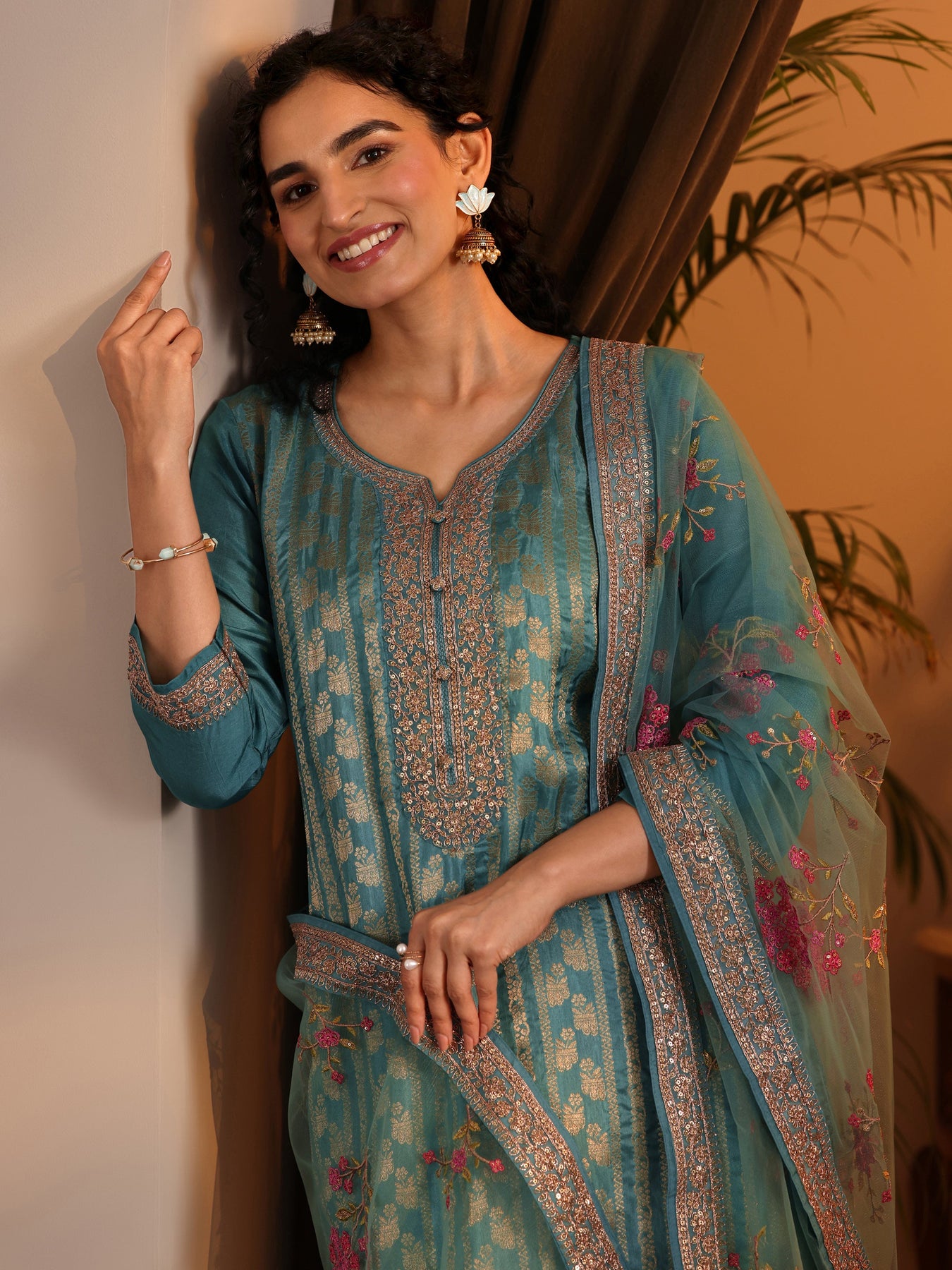 Libas Art Blue Woven Design Silk Blend Straight Suit Set With Dupatta