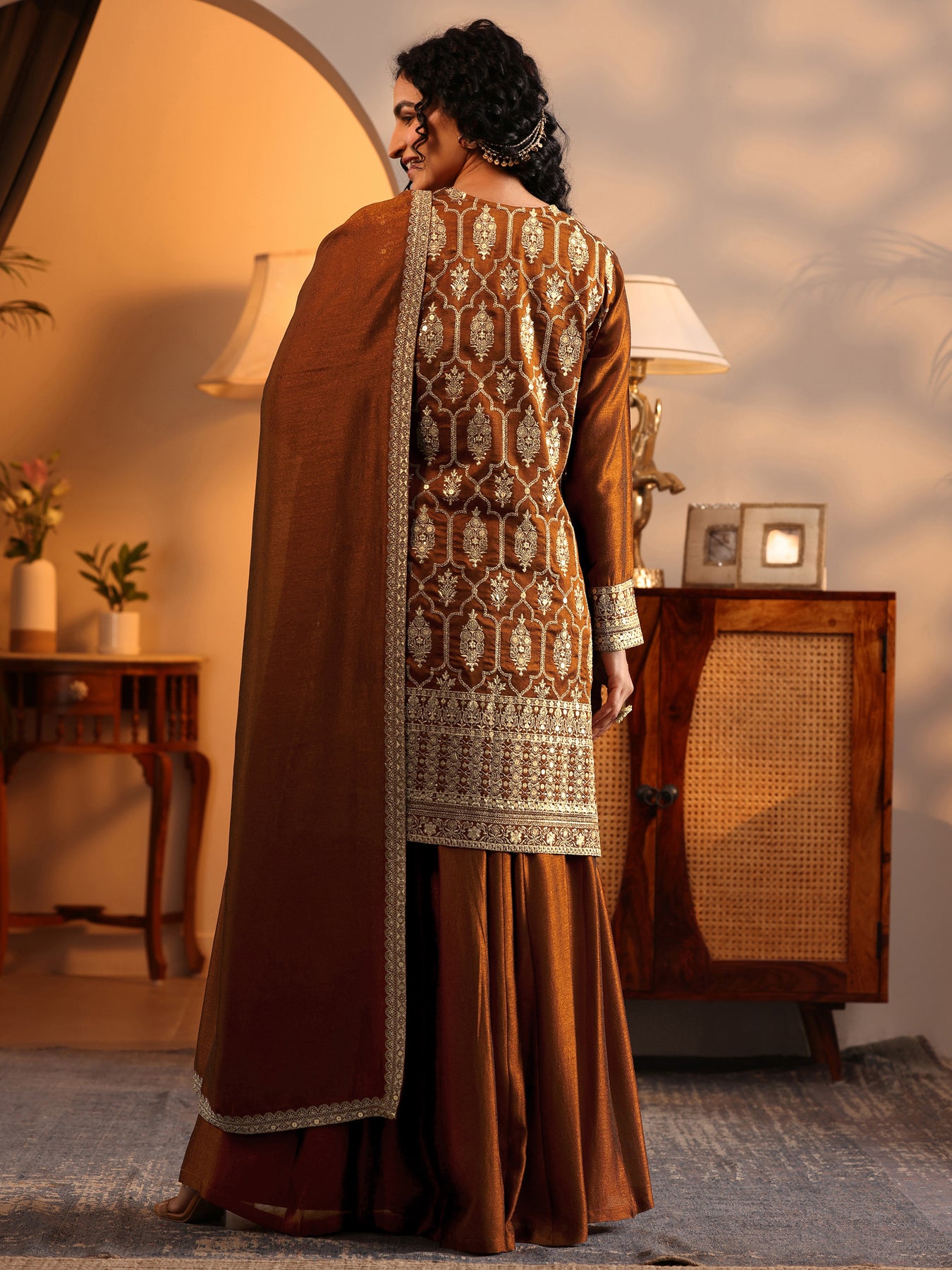 Libas Art Brown Embroidered Silk Blend Straight Suit Set With Dupatta