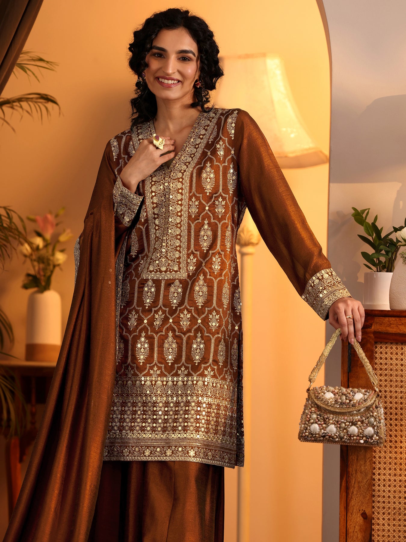 Our 3-piece brown silk blend straight-fit kurta set features a V-neckline, regular sleeves, and statement yoke. Complemented with palazzo pants with a partially elasticated waistband and 2 pockets, and an embroidered dupatta. Adorned with embroidered embellishments, this style is perfect for festive wear.